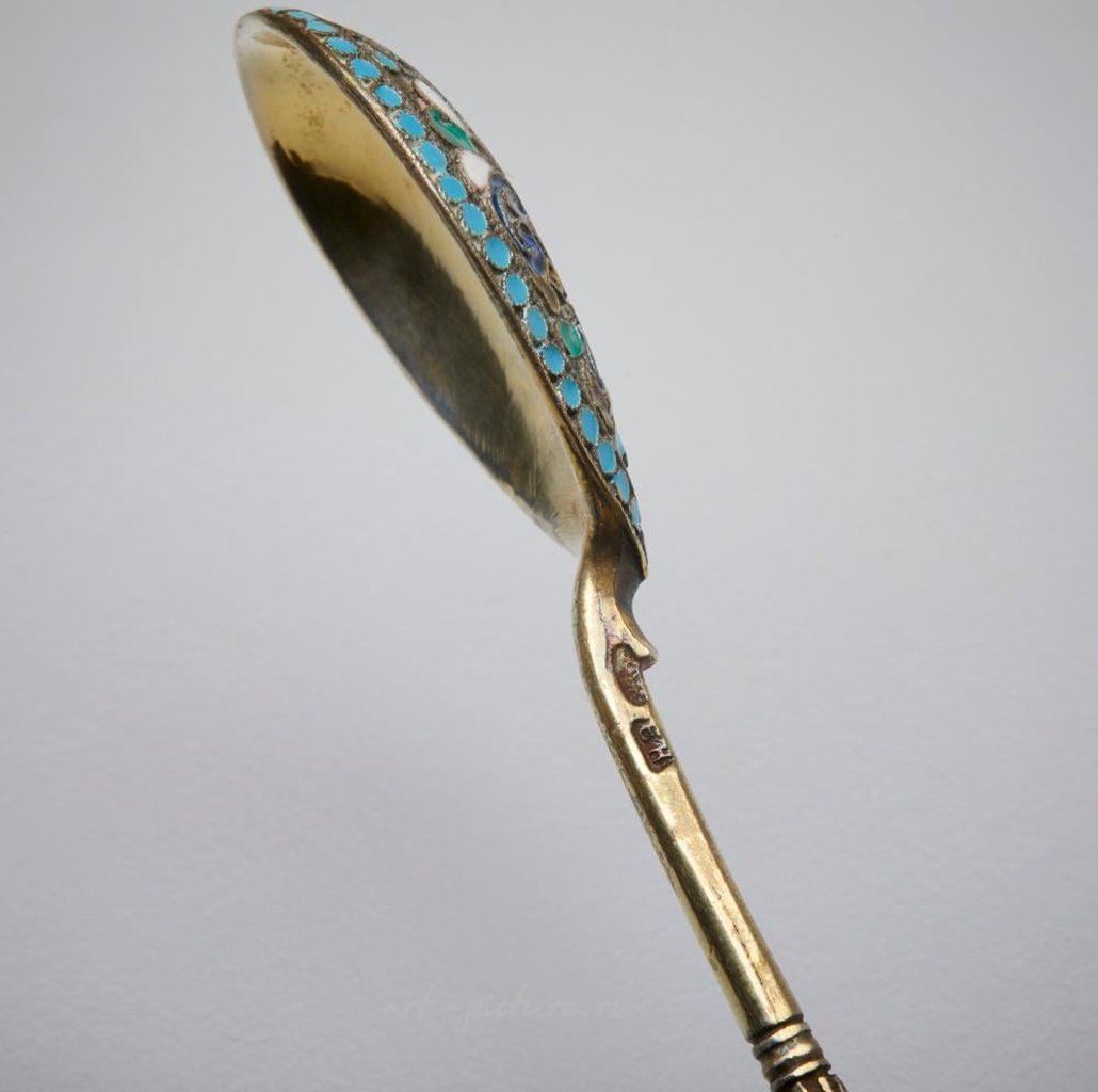 19-20 век русский серебряный мастер. Шесть чайных ложек из серебра с позолотой и полихромной эмалью. Марка серебра от Никанова Золотова. Общий вес: 0,124 кг. Происхождение: Частная коллекция, Милан. Размеры: 13,00 x 0,60 x 2,70 см.