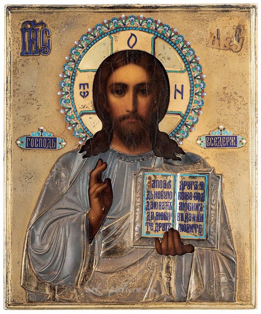 27х22 РУССКАЯ ИКОНА ХРИСТА С ПОЗОЛОТОЙ И ПЕРЕГОРОДЧАТОЙ ЭМАЛЬЮ, МОСКВА, 1896-1908; РЕСТАВРАЦИИ И УТРАТЫ