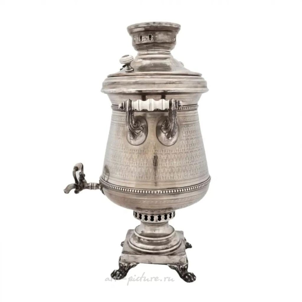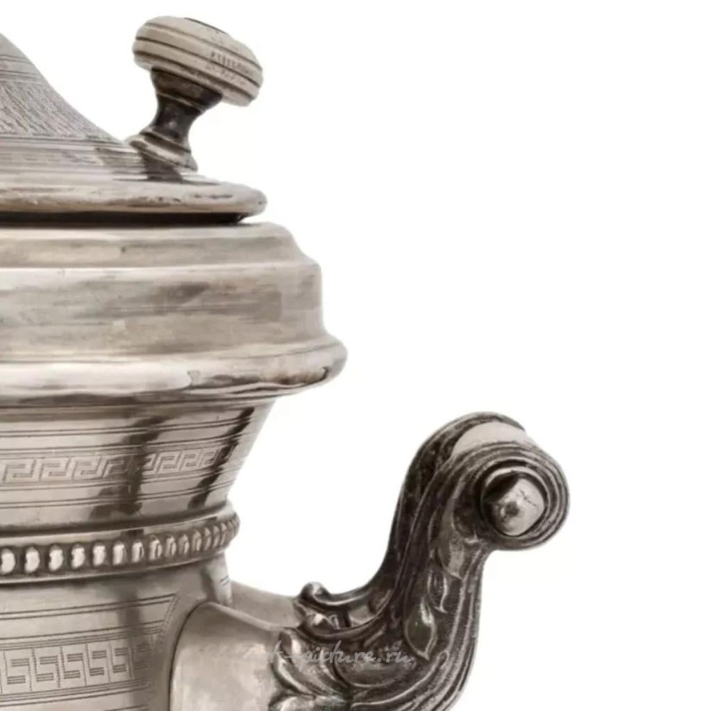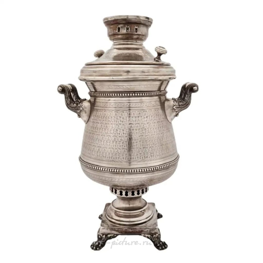 Большой, серебряный русский самовар, изготовленный из серебра 84 пробы, торговый дом И.Е. Морозов. Установлен на подставку с четырьмя фигурными ножками в форме лап. Самовар украшен геометрическим орнаментом, а также резным узором по всей поверхности, выполненным резцом. Держатели ручек выполнены в виде листвы, а сами ручки изготовлены из бакелита. Маркировка: Морозов и двуглавый.