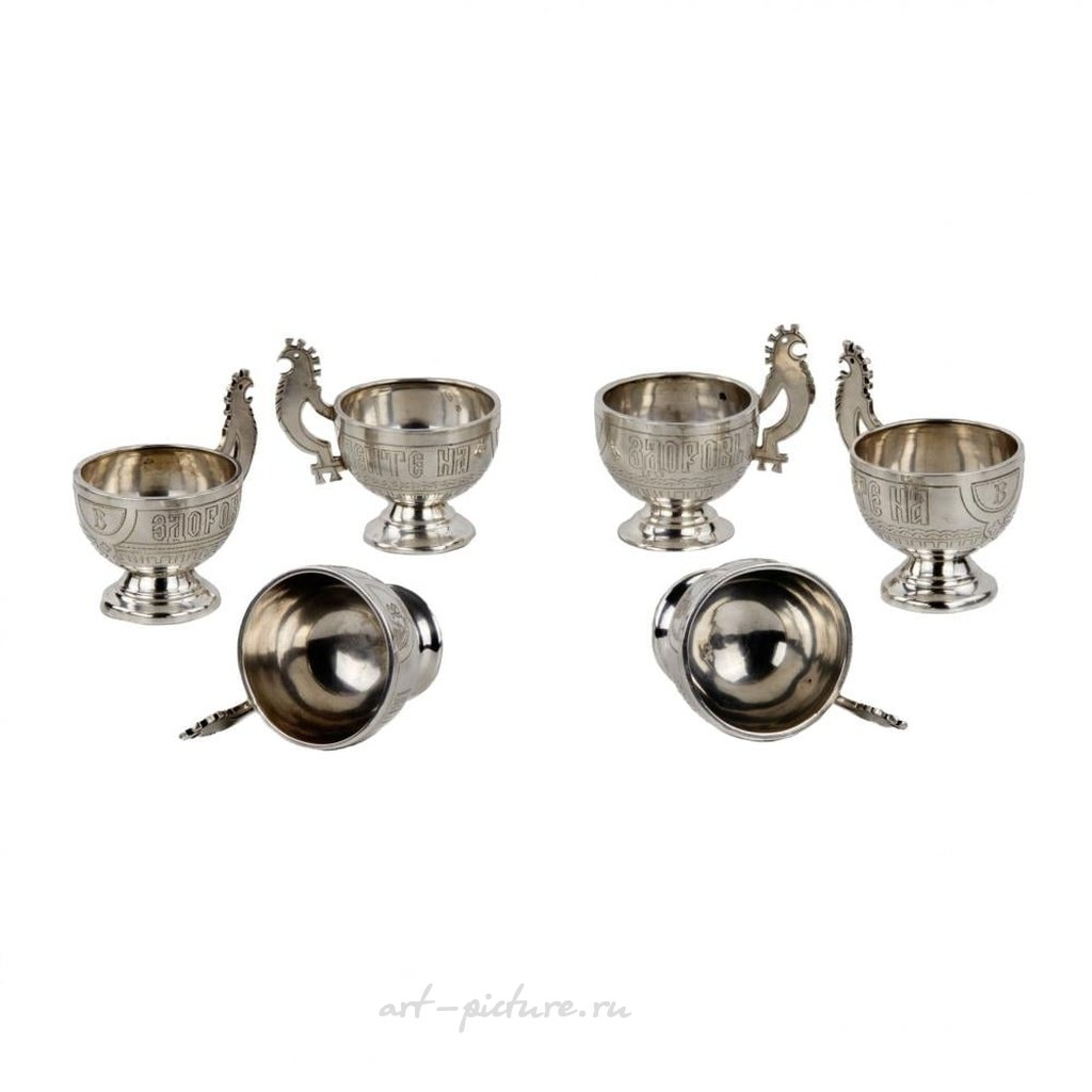 Элегантный водочный набор в неорусском стиле изготовлен из серебра и включает в себя декантер и шесть ножек на подносе. Оригинальный мотив вырезанных петухов на ручках переплетается с фантазийным гравированным мотивом планок на декантере и подносе. Ножки дополнительно украшены надписью "За ваше здоровье". Московские клейма серебра 84 пробы, 1881 год. Испытательный мастер АК. Мастер-изготовитель СИ, вероятно, С.М. Иконников, серебряник.