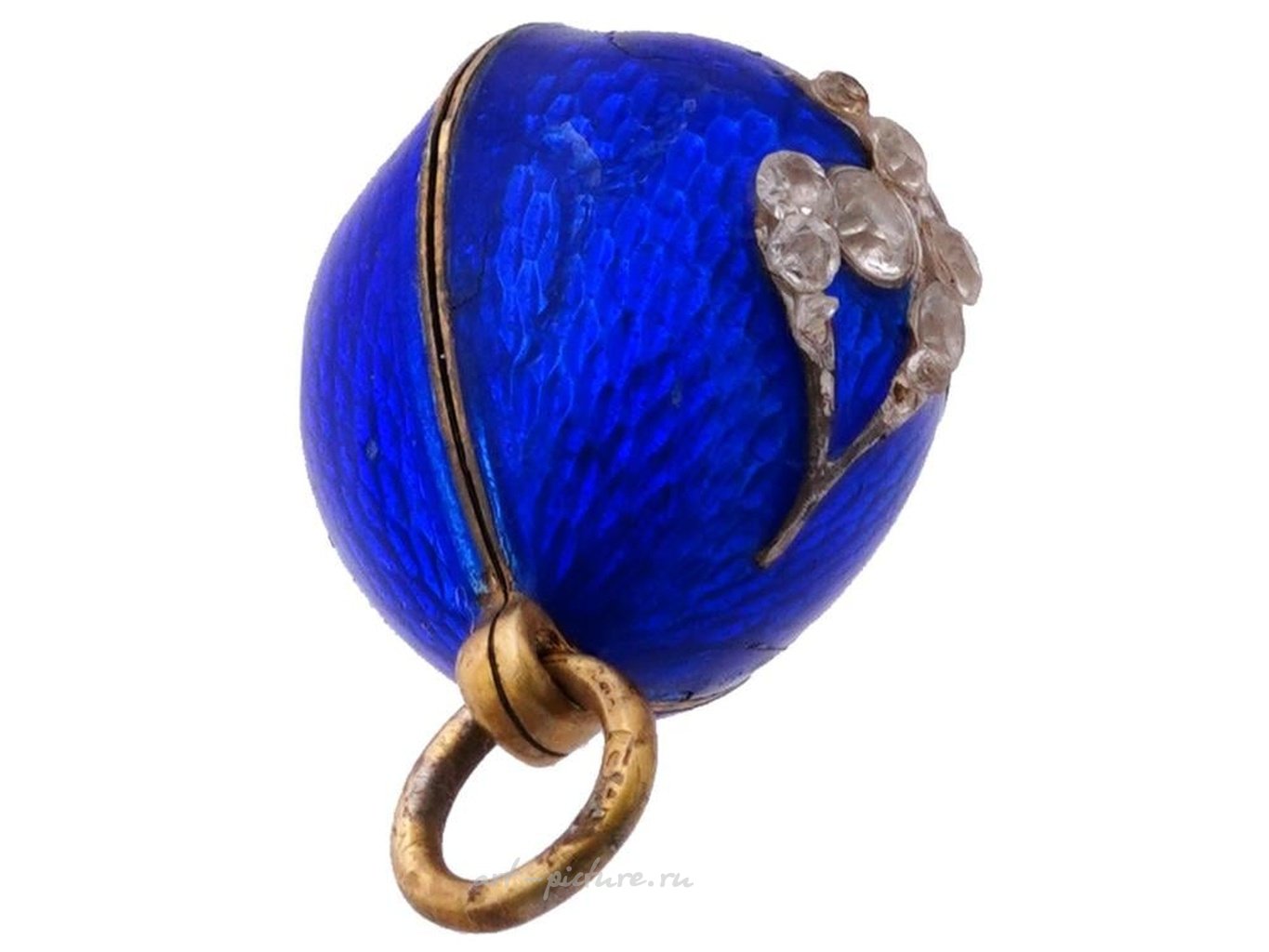 Русская подвеска в форме яйца из серебра с позолотой и синим эмалевым покрытием. На передней стороне подвески украшены бриллиантами. Кольцо для подвески имеет клеймо стандарта серебра 84. Вес: 5 грамм. Русская ювелирная продукция, серебряные изделия и коллекционные предметы.