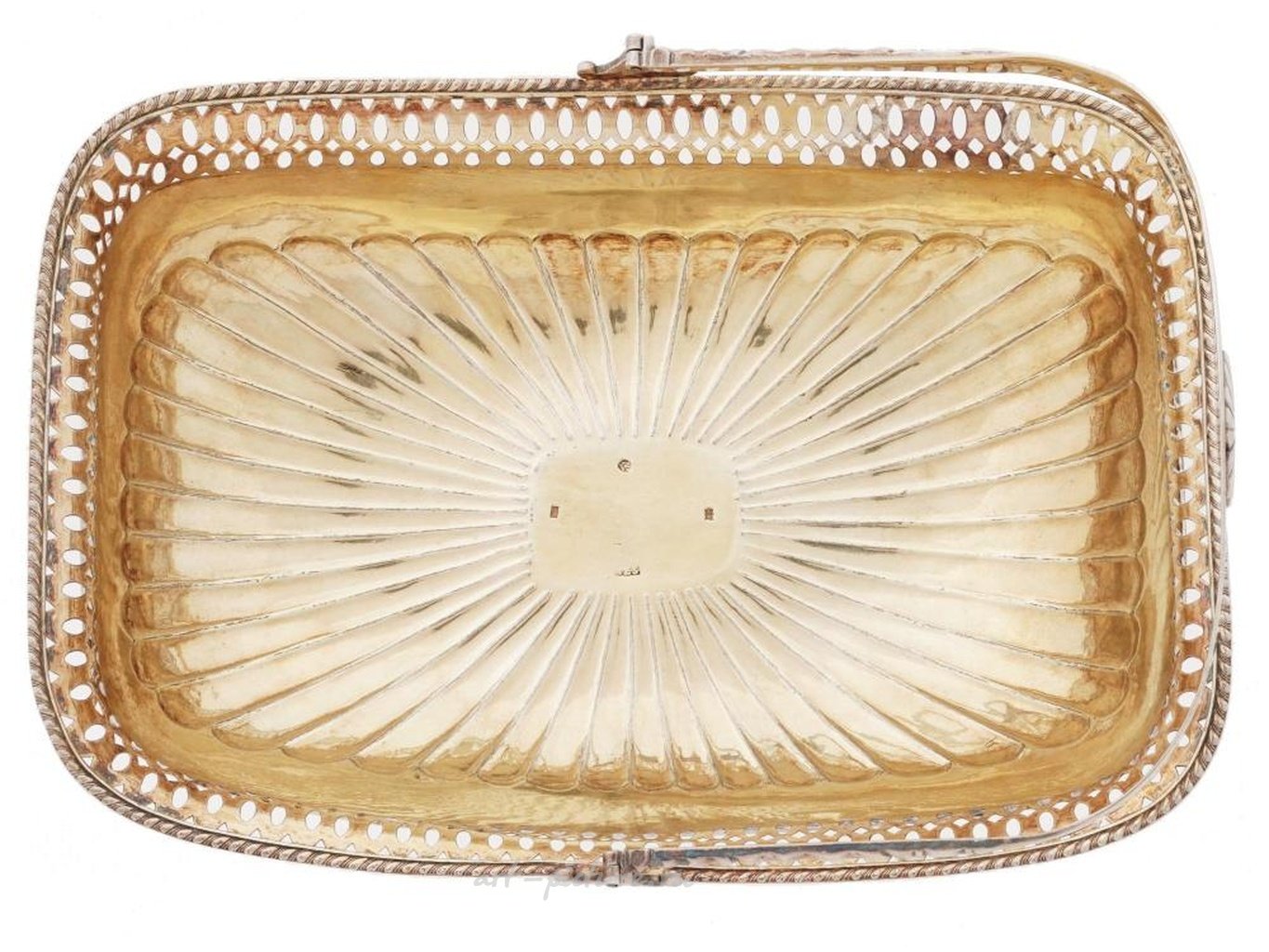 Имеет поворотную ручку, венчающую прямоугольный корпус с ободком из гадруна, ажурной каймой и рифленым основанием, приподнятым на ступенчатом прямоугольном основании. Позолота внутри. Маркировка 84 пробы серебра и маркировка производителя. Вес: 700 г. Предметы коллекционирования из Русского Серебра.