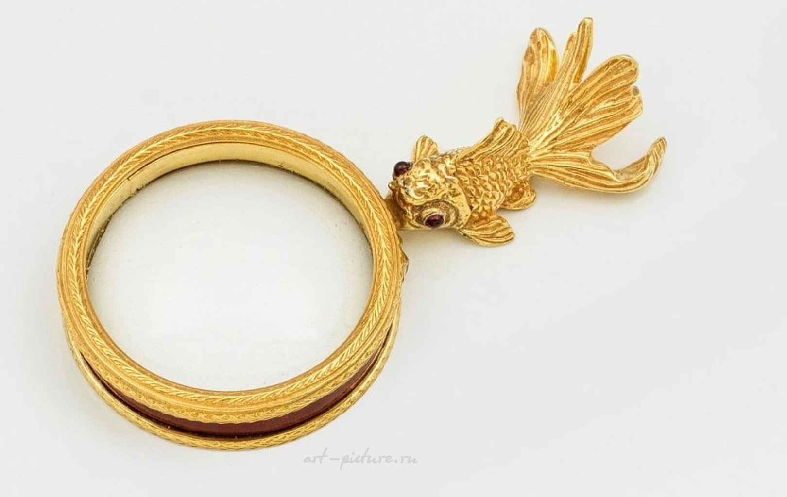 в стиле Карла Фаберже. С деревянным футляром. Позолоченное серебро. Украшенная, профилированная рамка с красной эмалью и волнистым гильошированным краем. Ручка полностью скульптурно изображает золотую рыбку с гранатовыми кабошонами в качестве глаз. Есть незначительные повреждения. Помечено 88. Вес примерно 90 г. Длина 9 см. Диаметр увеличительного стекла 4,5 см. Русское позолоченное и эмалированное серебряное увеличительное стекло с ручкой в стиле.