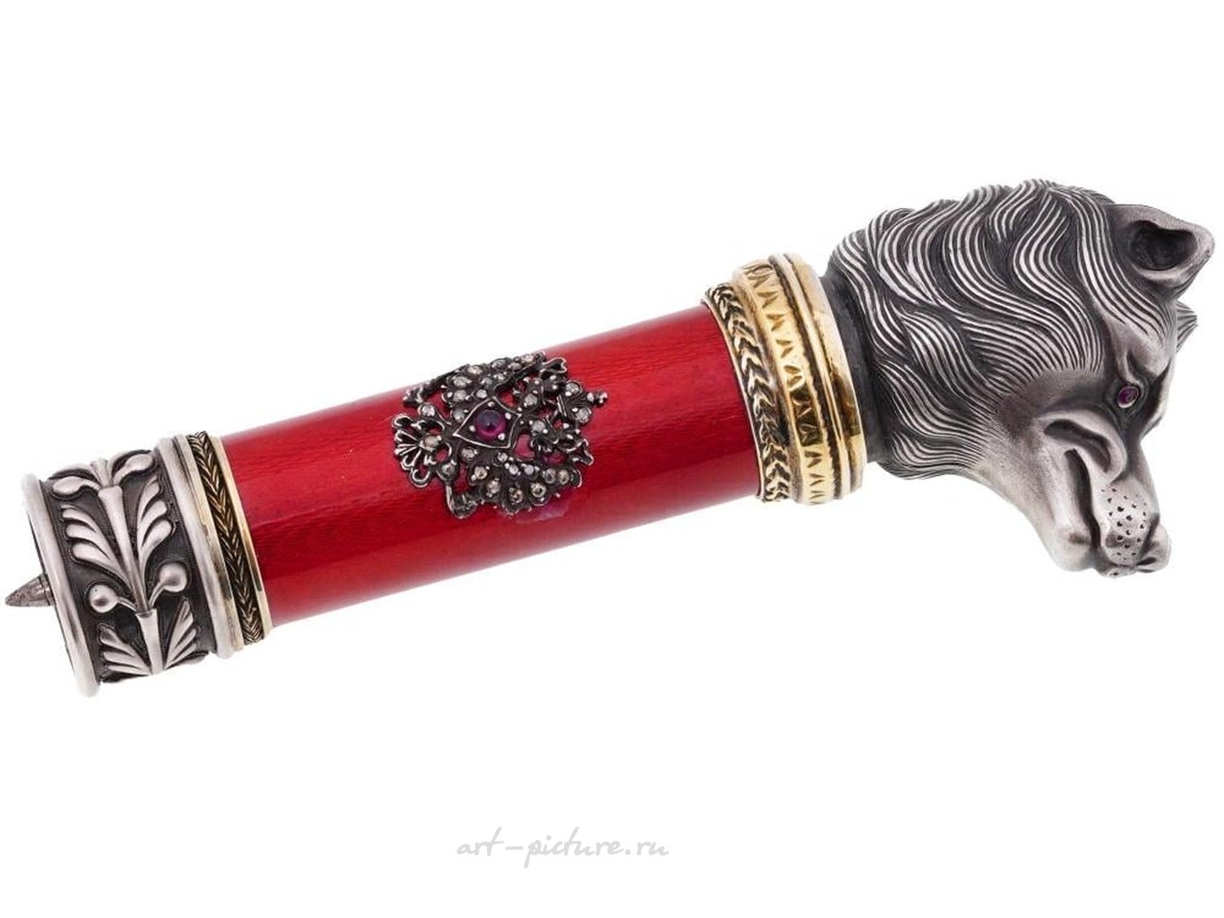 Ручка трости из русского серебра, украшенная российским императорским двуглавым орлом, украшенным бриллиантами и драгоценными камнями на красном эмалевом основании, выполненном в технике гильоширования с позолоченными ободками. Изделие увенчано серебряной собачьей головой с изумрудными глазами. Клеймо производителя и 88 пробных знаков российского серебра. Общий вес: 99 г. В деревянном футляре. Трости из Российского Серебра и предметы коллекционирования Модных Аксессуаров.