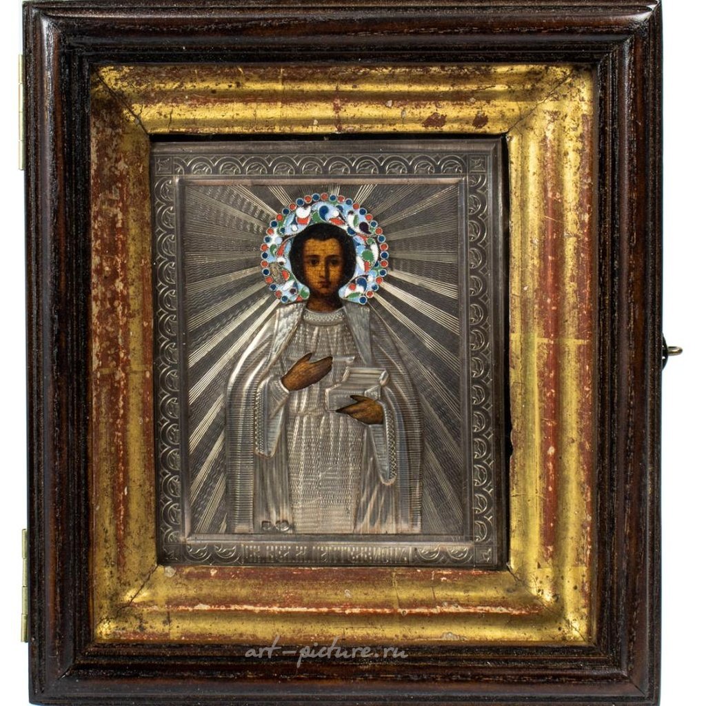 Русская серебряная окладная икона святого Пантелеймона .84, возможно, Емельяна Кузнецова, прямоугольной формы с серебряной окладной крышкой, в центре которой полуфигура святой в рясе, в левой руке она держит коробочку с лекарствами, с приподнятыми нимбами, тонко инкрустированными эмалями синего, белого, зеленого, красного, и черный, с серебряным клеймом калибра .84 и кириллическим знаком производителя на обложке и ореоле,
