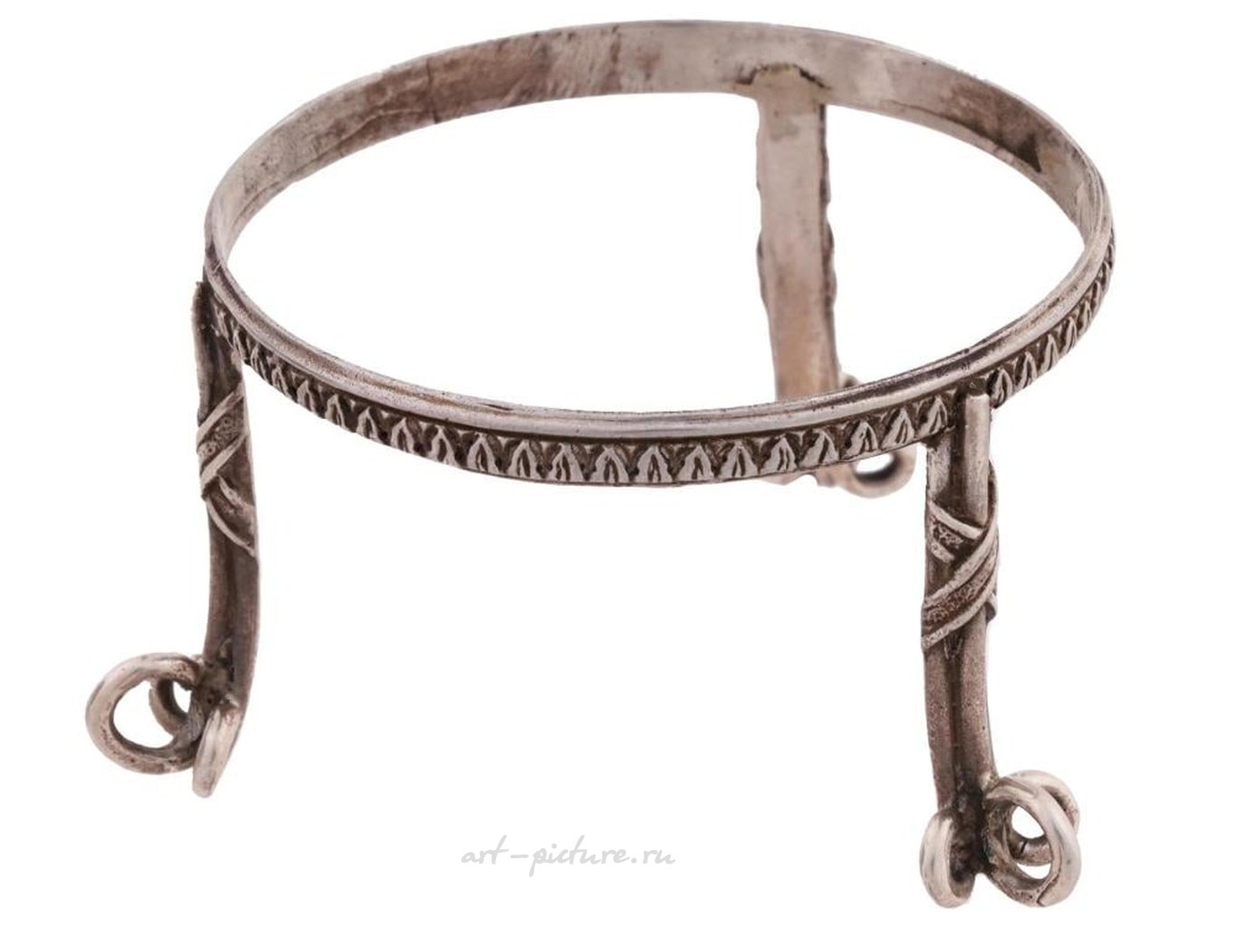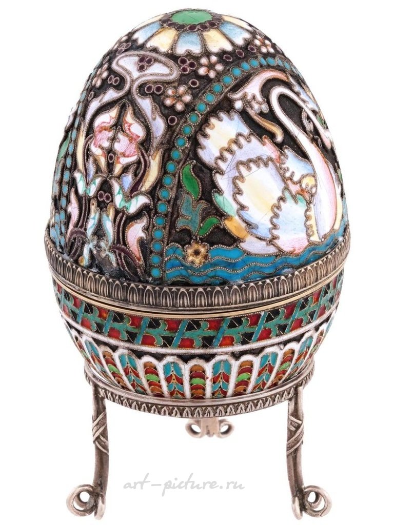 Русская серебряная и эмалированная шкатулка из серебра 88 пробы. Шкатулка разделена на две половины. Внутренняя часть покрыта золотистым покрытием. Внешняя сторона яйца эмалирована полихромными цветочными, растительными, геометрическими и узорами в виде свитков, а также эмалированными изображениями лебедя на пруду. Завершается фигурным серебряным подставкой на ножках. Ножки выполнены в изогнутом дизайне и гравированы детальными узорами. Отмечено