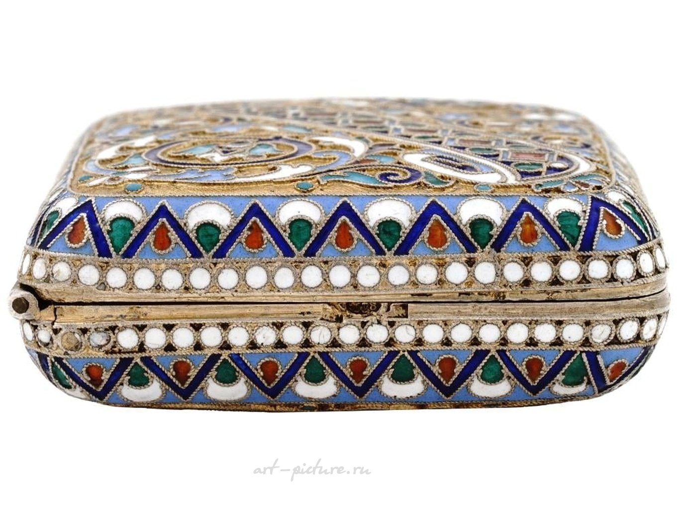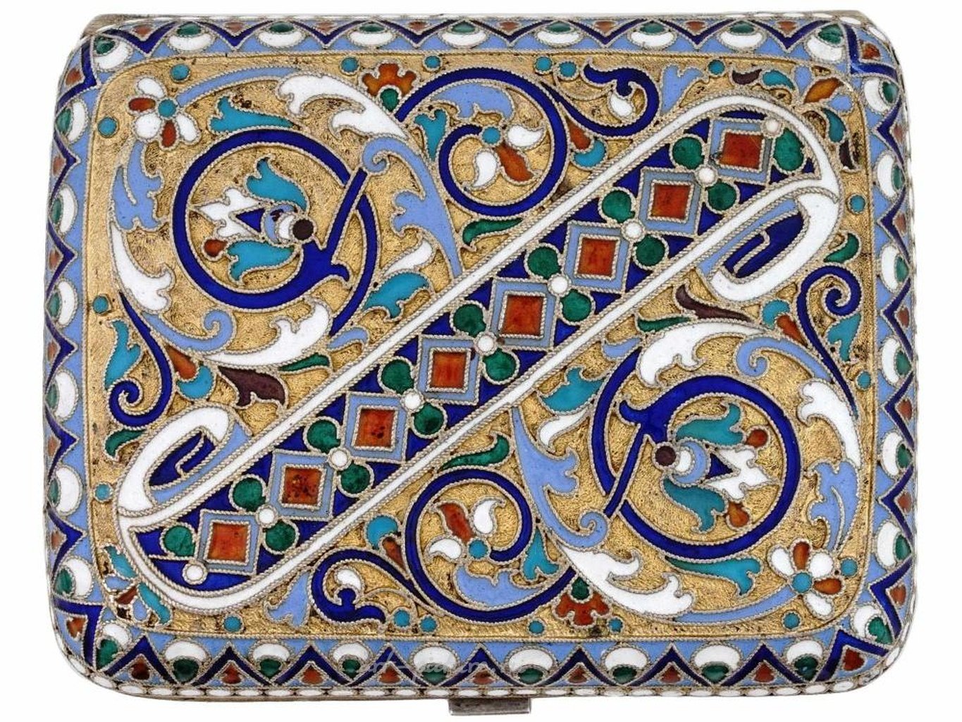 Портсигар из русского позолоченного серебра с откидной крышкой. Изделие украшено полихромной перегородчатой эмалью. На ободке - клеймо серебряной пробы 84 пробы и марка производителя. Общий вес: 118 грамм. Коллекционное Русское Столовое Серебро и Ювелирные Изделия, Табачные Аксессуары.
