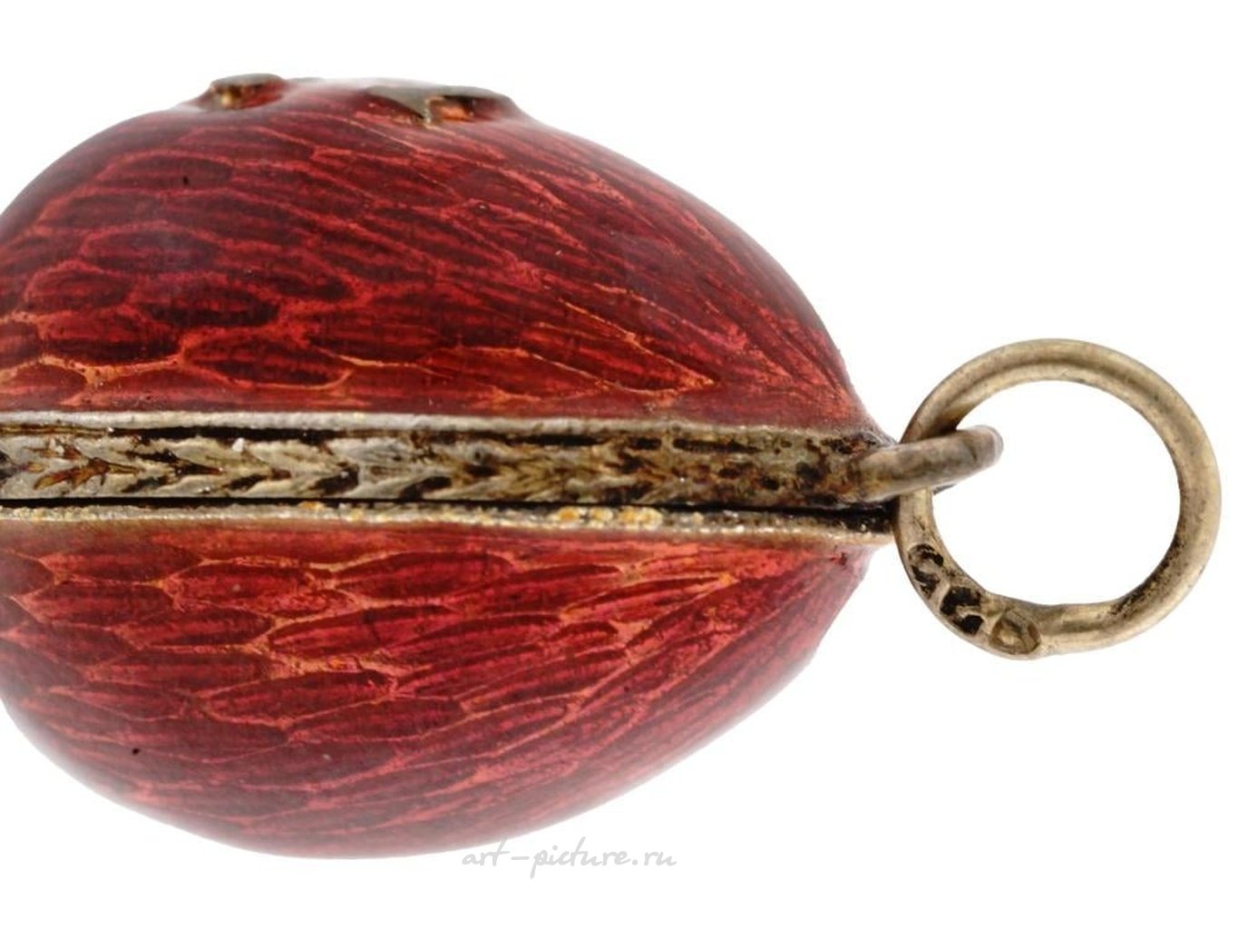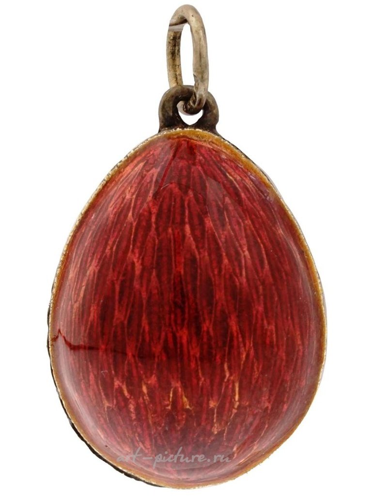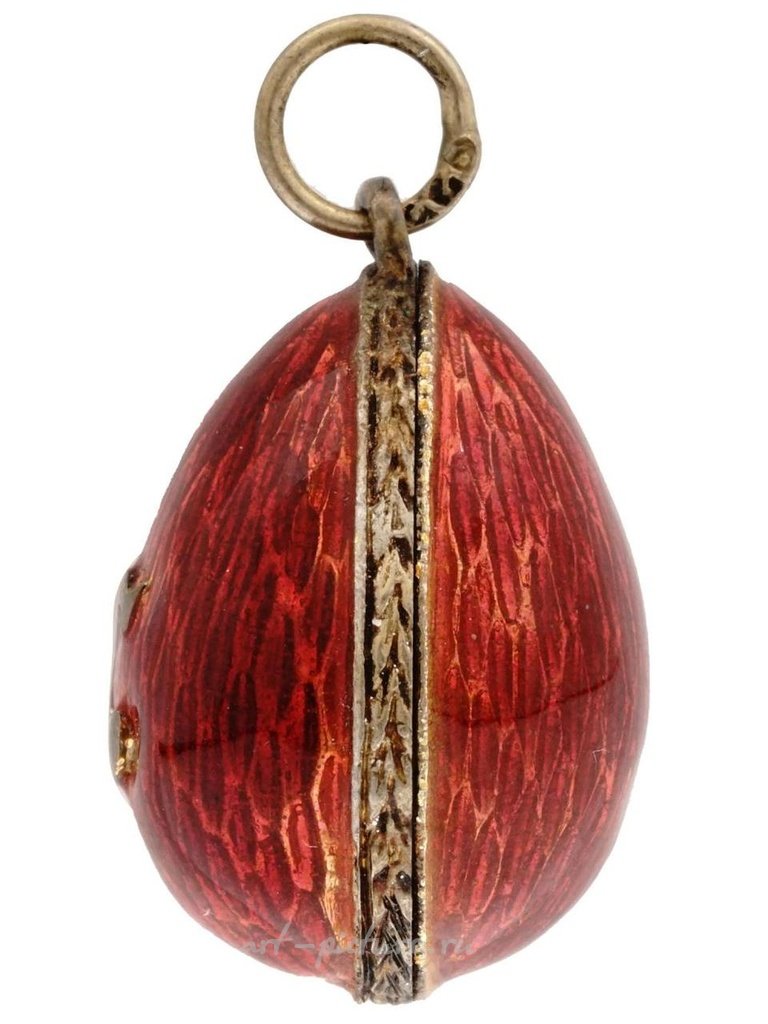 Миниатюрная подвеска в форме русского яйца из позолоченного серебра, покрытая мерцающей красной гильошированной эмалью. На передней стороне имеется выпуклая буква "С" из позолоченного серебра. Подвеска имеет клеймо с указанием стандарта серебра 925 на кольце для подвешивания. Коллекционные русские серебряные и золотые украшения, русские предметы декора, аксессуары и подарки для женщин. Вес 6,7 грамма.