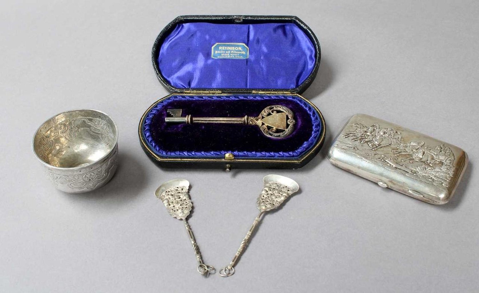 Коллекция разнообразного серебра, включающая русский серебряный стакан, по-видимому, без маркировки, 18 век, сужающийся кверху и украшенный листвой, основание украшено памятной российской монетой; русский серебряный портсигар, на лицевой стороне которого изображена сцена гонок двух троек на фоне пейзажа; подарочный ключ и две ложки с проколотыми краями. (5)