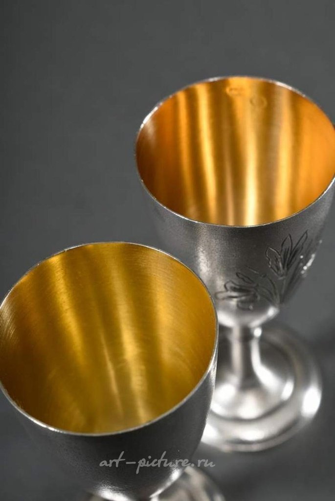 Пара русских рюмок на высокой подставке с цветочной гравировкой, неопознанный клеймо: "ТЮ 4"/"ТЮ 5", Тбилиси (Грузия), около 1960 года, серебро 875, 75 г, высота 9 см, незначительные следы давления.