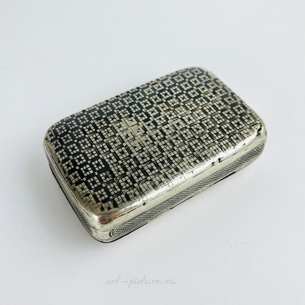 Маленькая русская коробочка из серебра с выточенным "пейзажем" и деталями из ниелло. Размеры 2,5 x 9,5 x 6 см. Имеет незначительные повреждения и износ. Вес 140 грамм.
