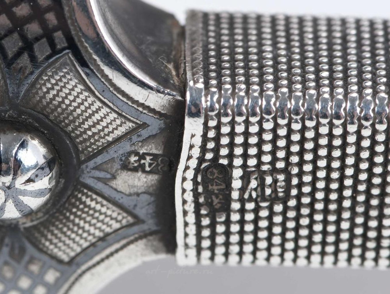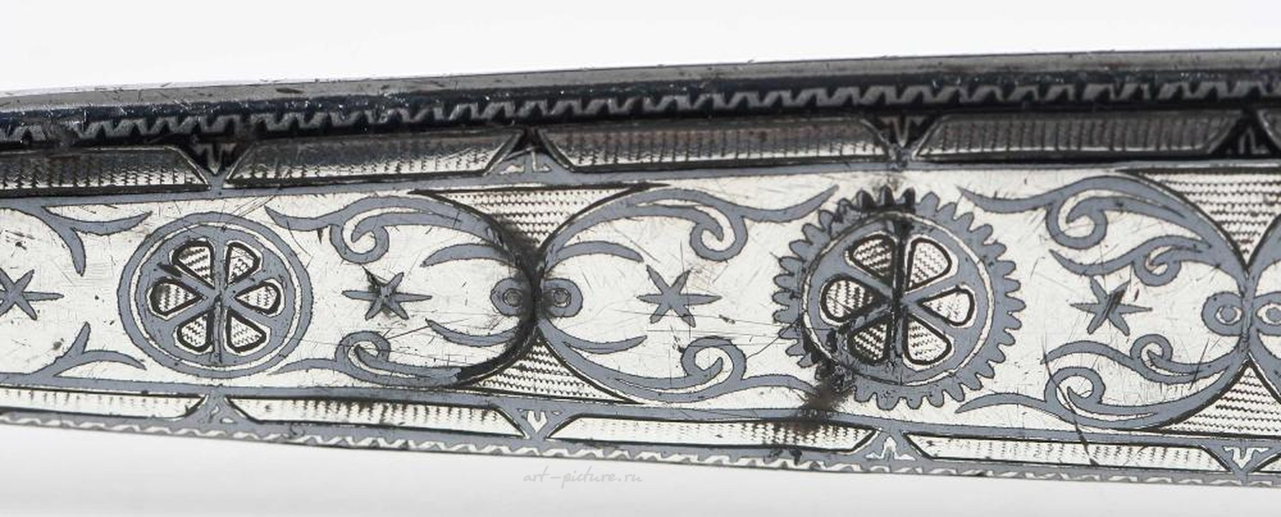 Москва, 19 век, общий декор в стиле арабески, проволочная обмотка на рукояти и ножнах, ножны с деревянной внутренней частью, надпись кириллицей на обороте, клеймо производителя, 875 пробы, 20-1/4 дюйма. в целом, лезвие 13-1/2 дюйма. Происхождение: Коллекция влиятельной семьи из Атланты, штат Джорджия.
