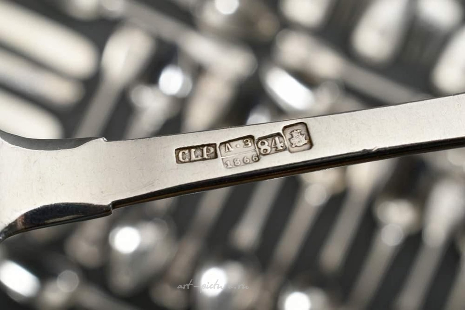 53 предмета русских столовых приборов "резьбовой узор" с пластически нанесенным гербом ливонского рыцарства "Шагающий грифон с мечом" под княжеской шапкой, ММ: AB/CLP (Андрей Степанович Брагин/Карл Людвиг Перслинг), марка города: Санкт-Петербург 1851/Рига 1866, серебро 84 пробы, 2109 г (без ножей): 12 больших ножей, маленькие ножи