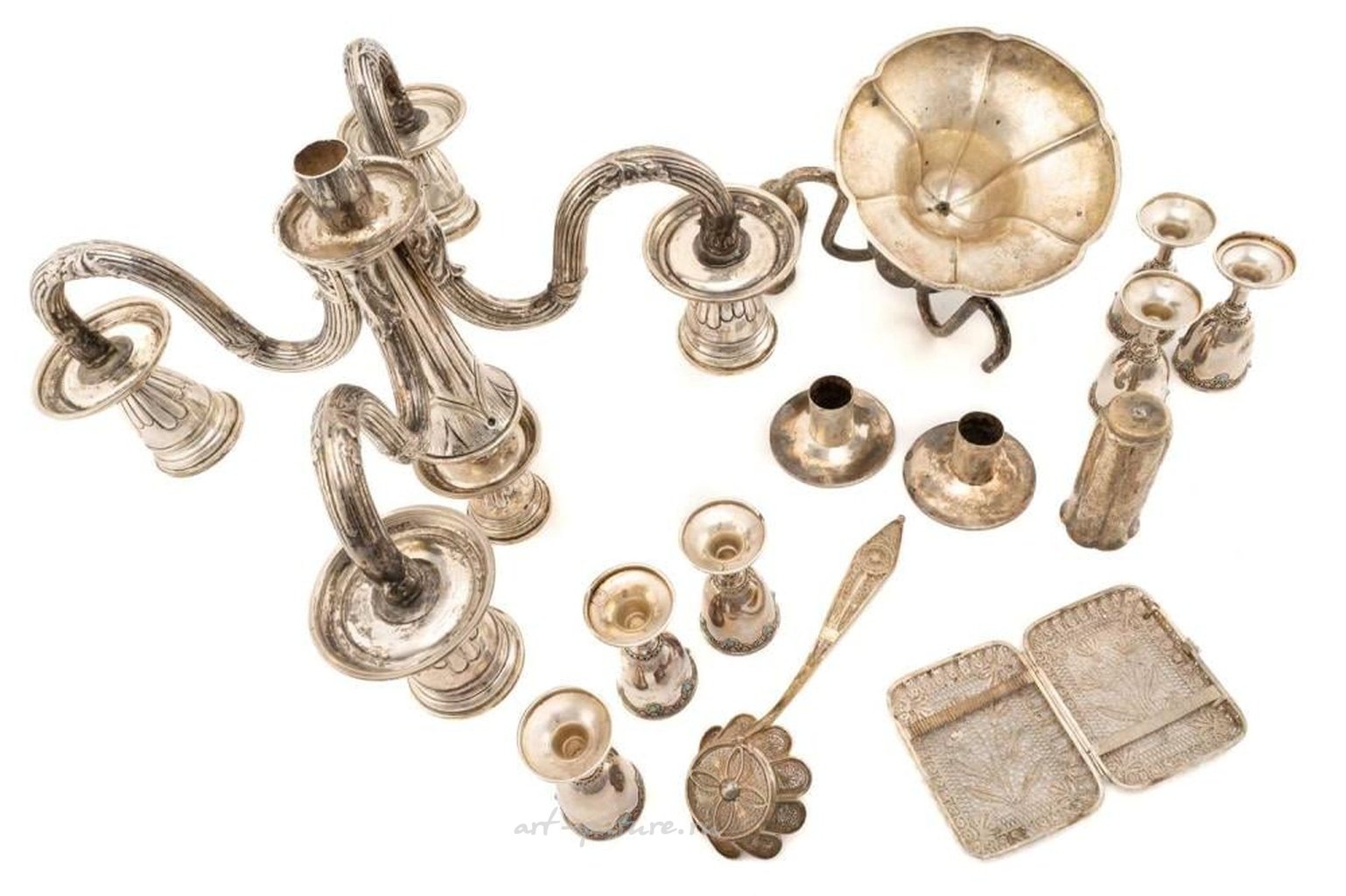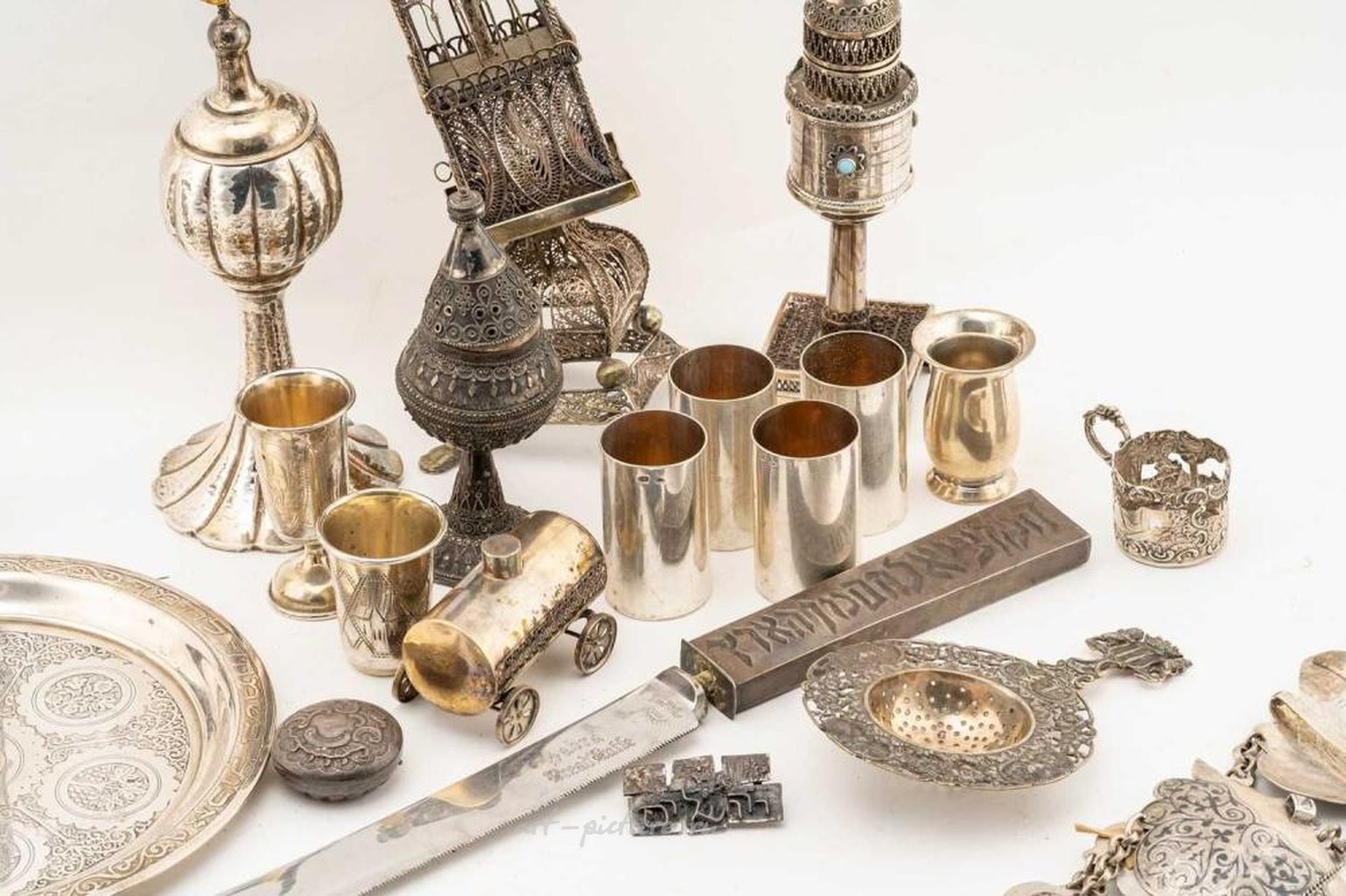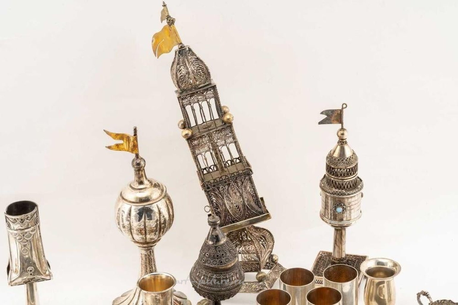 Интерес к юдаике, возможно русская серебряная башня для специй Бесамим, выполненная в филигранной технике, без маркировки, высотой 28 см, вместе с еще одной меньшей башней для специй цилиндрической формы, украшенной кабошонами из бирюзы, а также двумя другими башнями для специй. Маленькая серебряная тарелка, возможно, для Пасхи (?), серебряный нож для Халлы с рукояткой, специальный вагончик для специй, русский ниелло и серебряный пояс и другие предметы. Вес серебра, подлежащего взвешиванию, составляет 40,3 тройских унции.