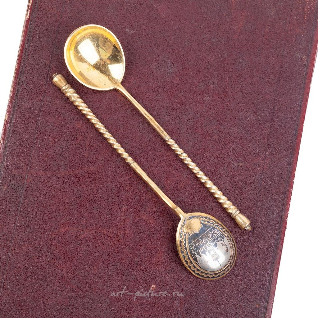 Набор чайных ложек из русского серебра с позолотой и чернью (12 шт.) с различными видами Москвы в оригинальном футляре. Клеймо производителя С.Левина. Москва, 1880 год. Длина ложки: 13,4 см. Общий вес: 243 г.