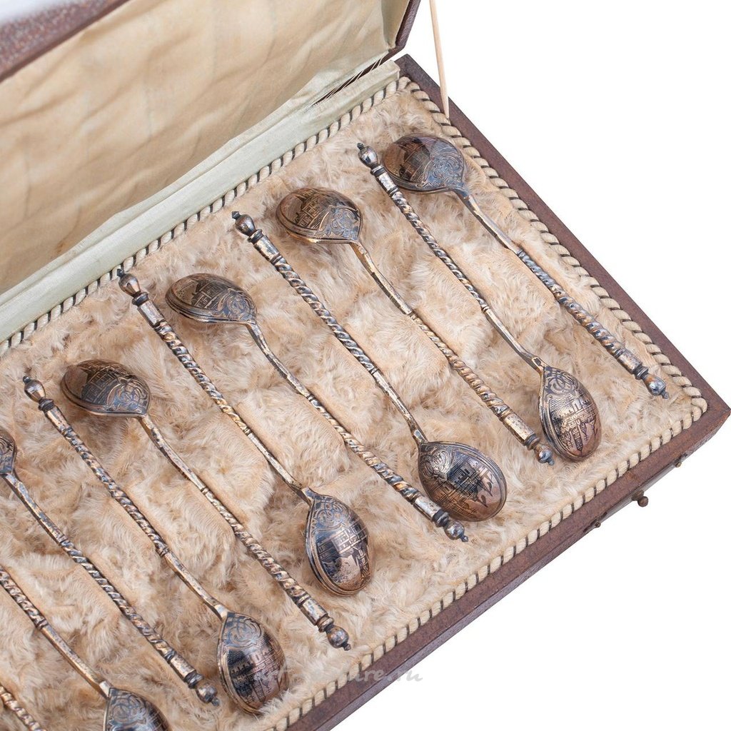 Набор чайных ложек из русского серебра с позолотой и чернью (12 шт.) с несколькими видами Московского Кремля в оригинальном футляре. Москва, 1888 год. Длина: 11,2 см. Общий вес: 180,4 г.