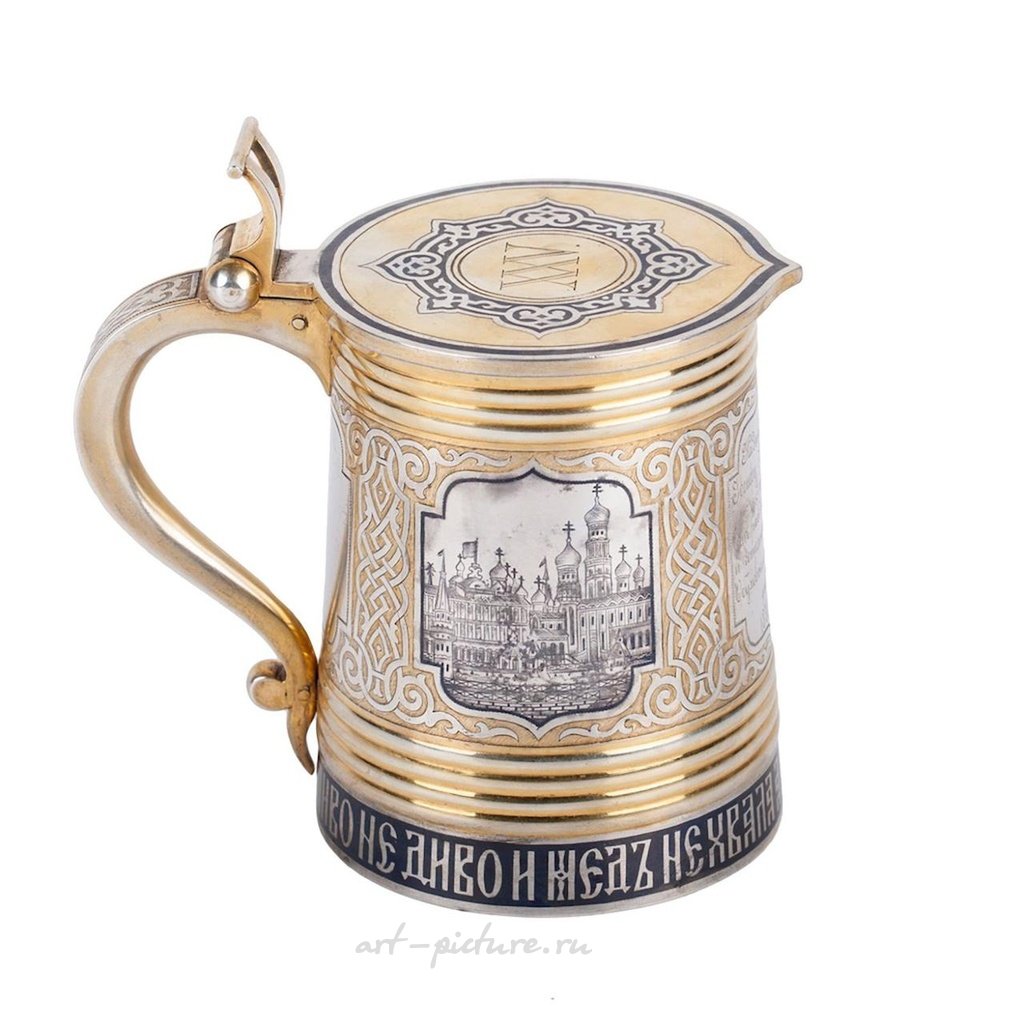 Российская подарочная кружка из серебра с позолотой и чернью с несколькими видами Московского Кремля и пословицей. Клеймо изготовителя Василия Семенова для мануфактуры Овчинникова. Москва, 1892 год. Высота: 10,5 см. Диаметр: 7,4 см. Вес: 428 г.