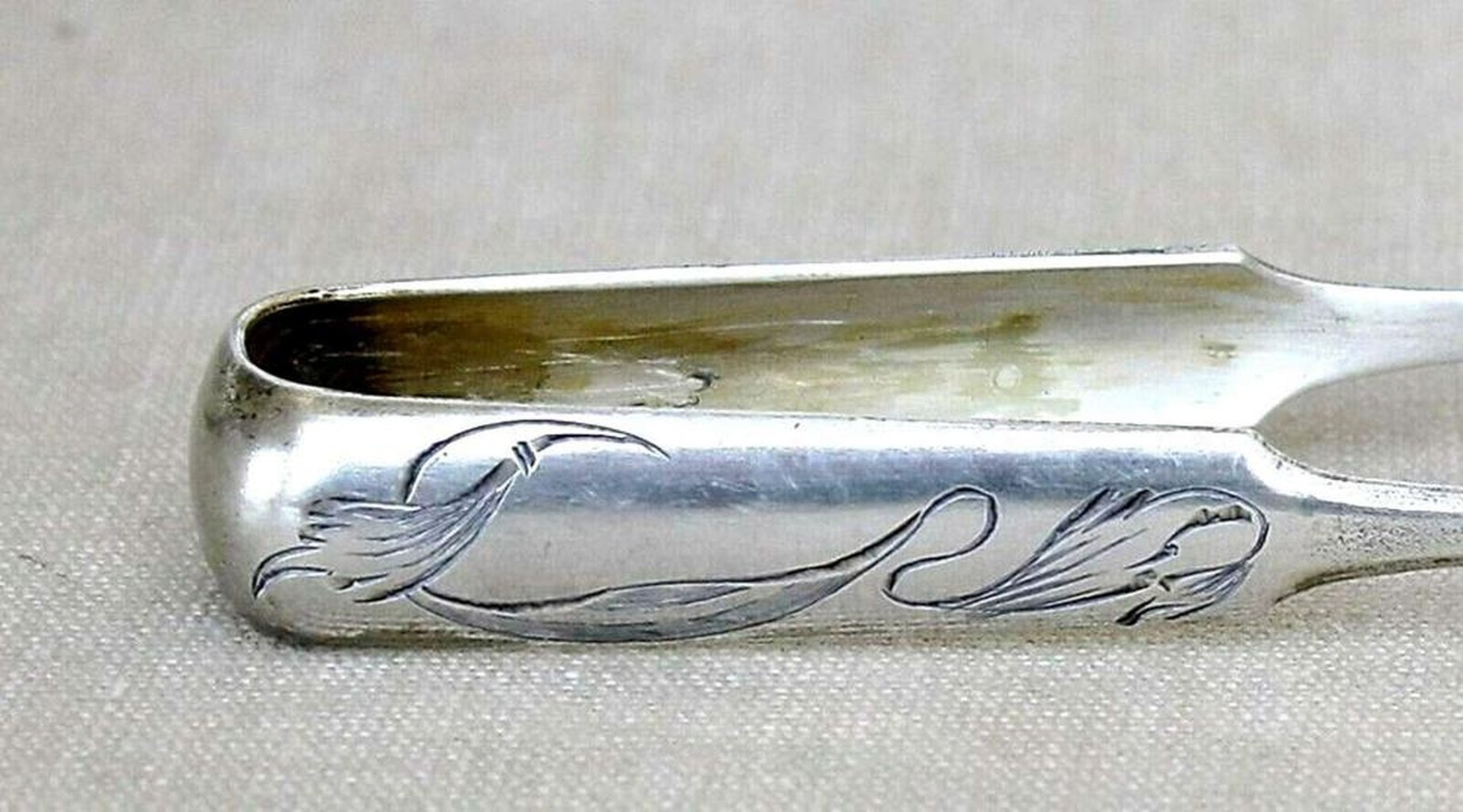 Щипцы для сахара из позолоченного серебра в стиле русский модерн 84 пробы с гравировкой, вес: 35 гр. КОНЕЦ 19–ГО - НАЧАЛО 20-ГО ВЕКА. РУЧНАЯ РАБОТА. гравюра. ПОЗОЛОТА ВНУТРИ С МАРКИРОВКОЙ: 84, И ЖЕНСКАЯ ГОЛОВА С КЛЕЙМОМ ПРОИЗВОДИТЕЛЯ ДЛИНА: 14,2 см. (5,5 дюйма) ШИРИНА: 1,5 см. (0,5 дюйма) ПОЗОЛОТА ПОЧТИ СОШЛА