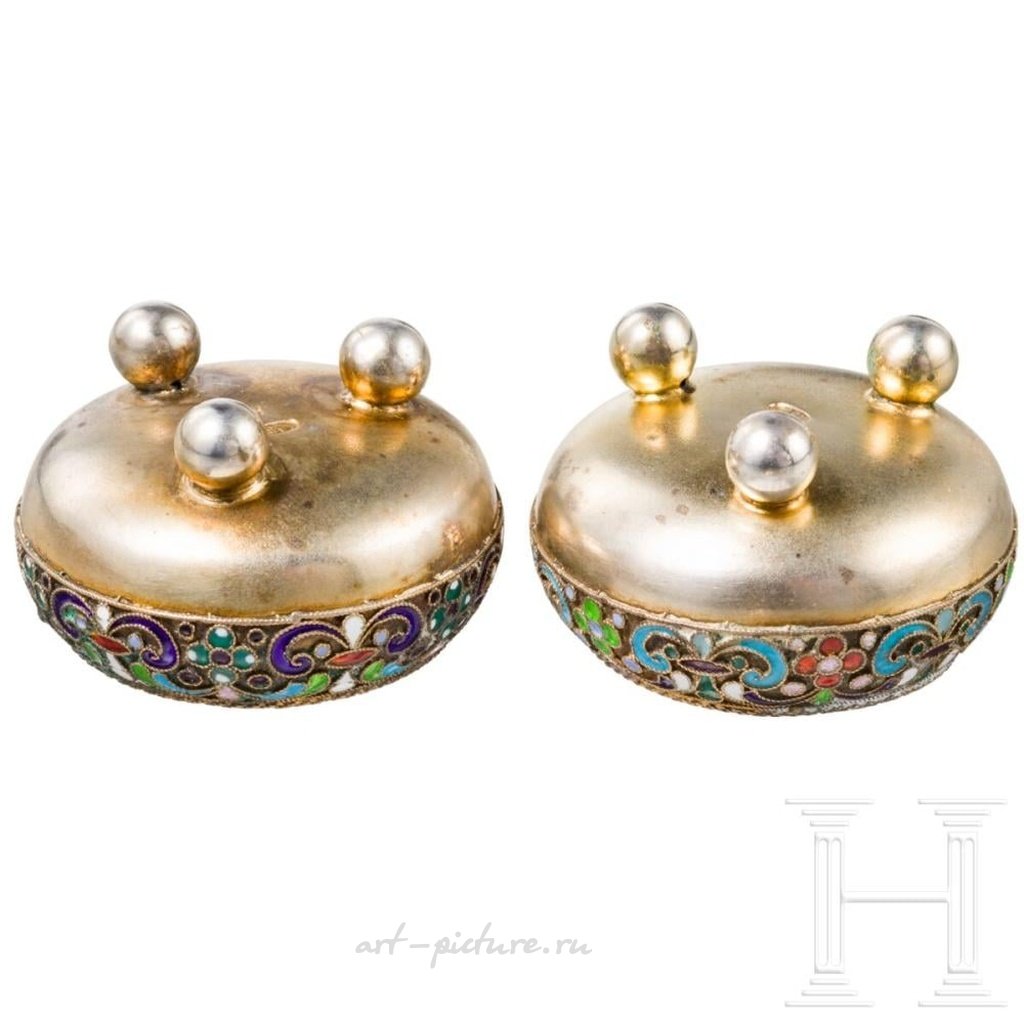 Серебро, частично позолочено. На трех шариковых ножках. Стенка украшена цветами и листвой полихромной эмалью на перфорированном фоне. На перфорированном фоне нанесена пробирная марка с пробой "84" и клеймом мастера "GP" кириллицей, ложка с клеймом мастера "AM". В футляре с ювелирным клеймом "И.В. Морозов С.П.Б". Диаметр солонки 3,7 см, длина ложки 6,2 см, вес 50 г. Состояние
