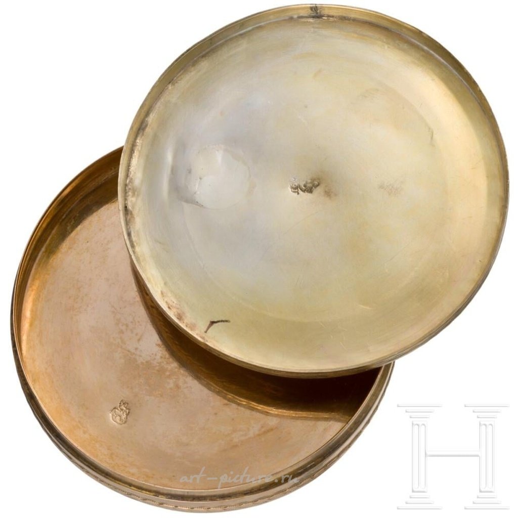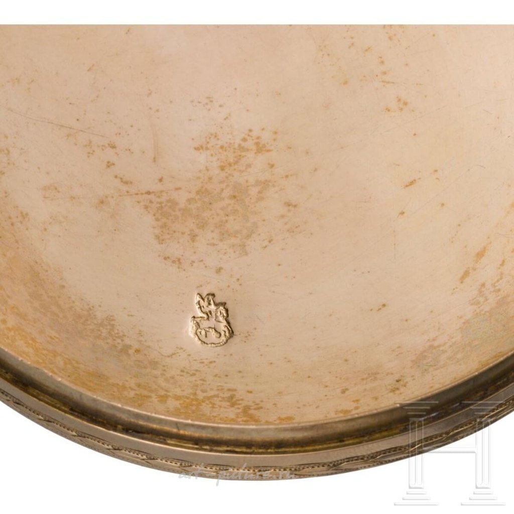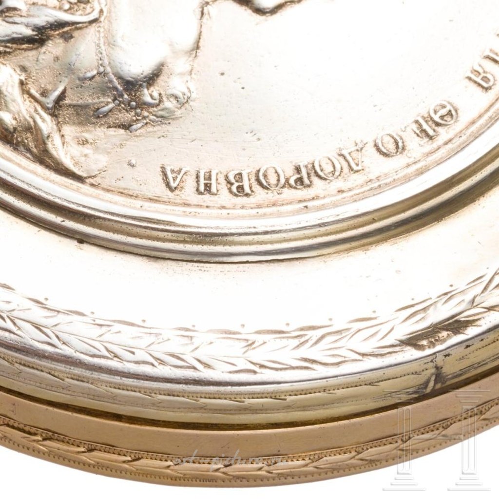 Серебро, позолота. В центре крышки рельефный портрет великого князя Павла Петровича (1796 - 1801 император России) и его супруги, великой княгини Марии Федоровны, с надписью кириллицей, обрамленный лавровым венком. Нижняя сторона также украшена окантовкой в виде листьев. Внутри на нем выбит городской знак "1791". На краю есть место для пайки. К нему прилагается футляр с бархатной подкладкой