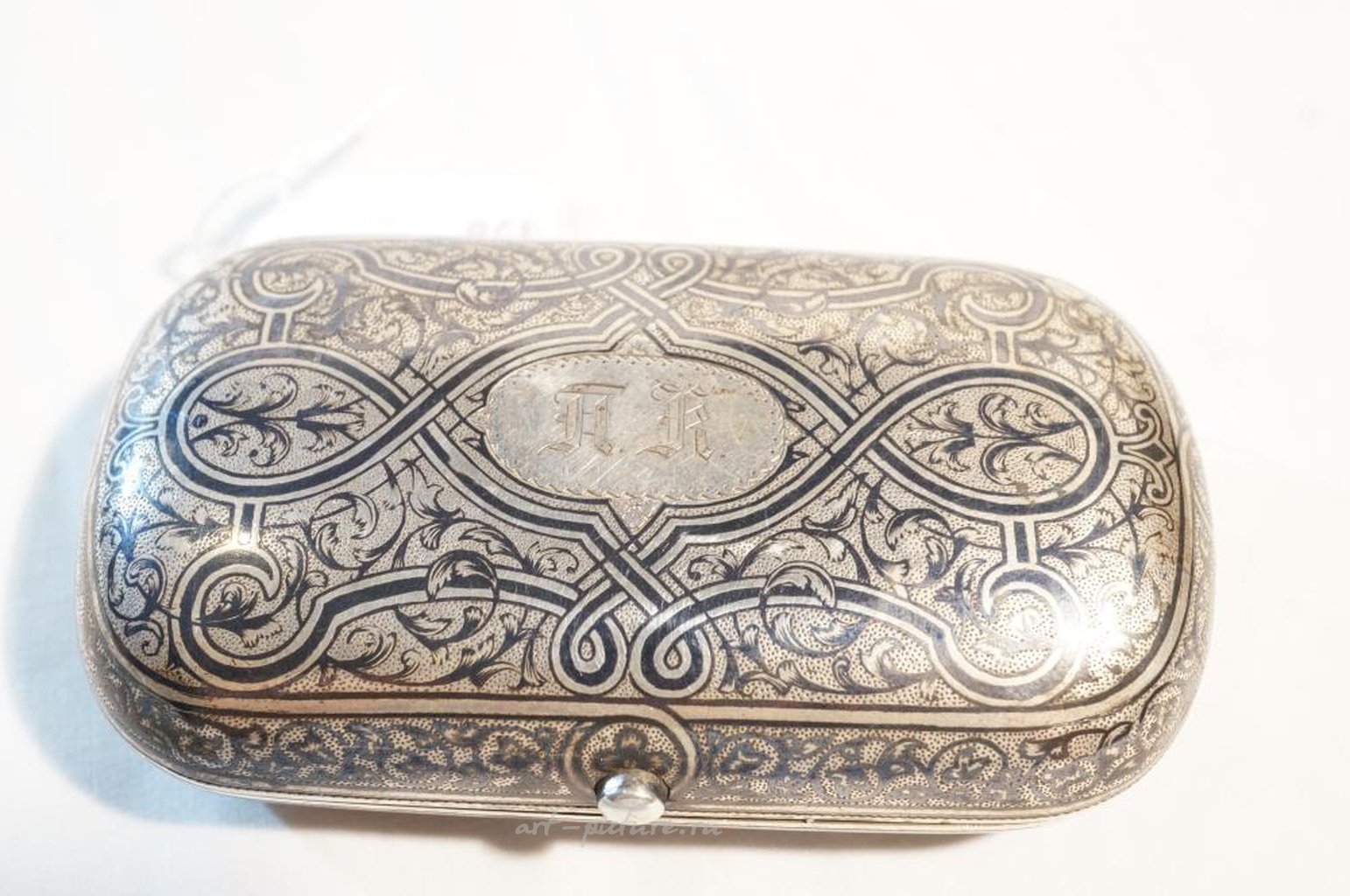 Старинный русский портсигар "тройка", отделанный панелями из серебра и чернил, с изображением зимних саней на крышке и цветочно-геометрическим орнаментом по всему основанию. На нем серебряная марка "Кокошник 84" и инициалы, датируемые примерно 1890 годом. Размеры: 2,8 см Ш х 9,5 см Г х 5,5 см В. Вес: 99 грамм.