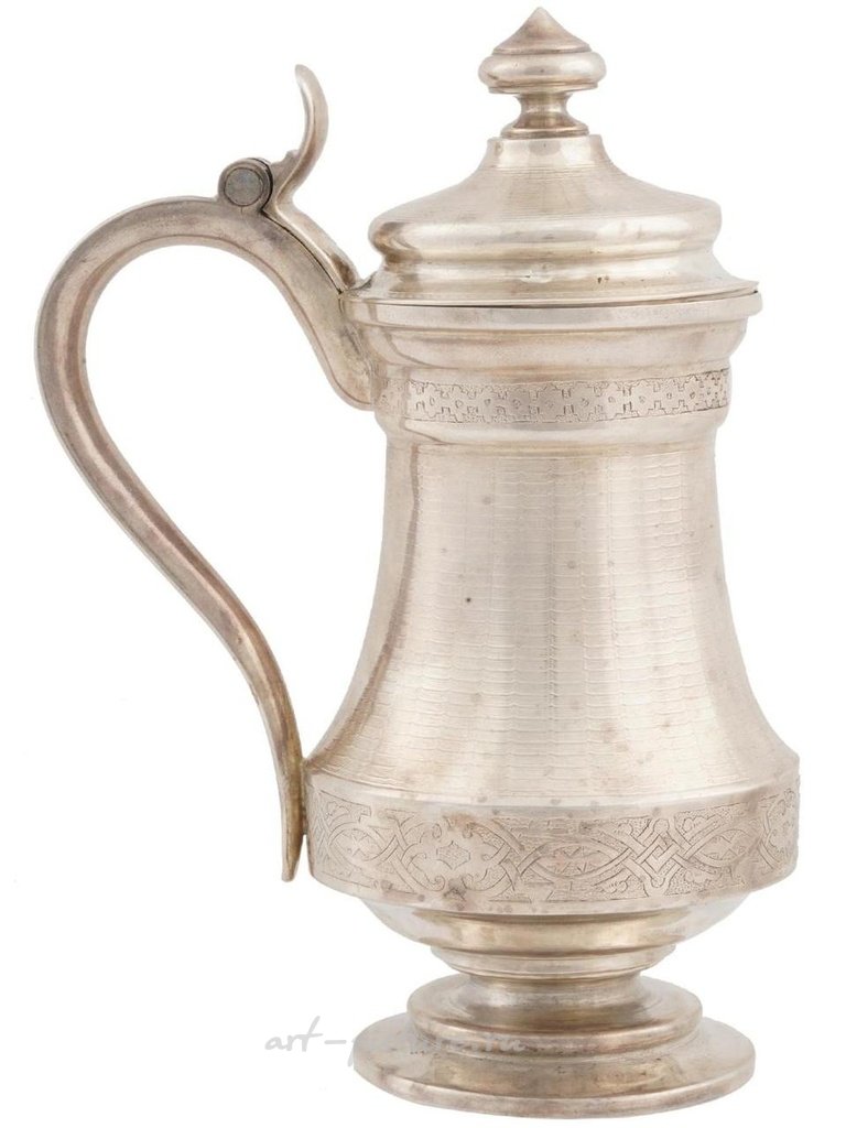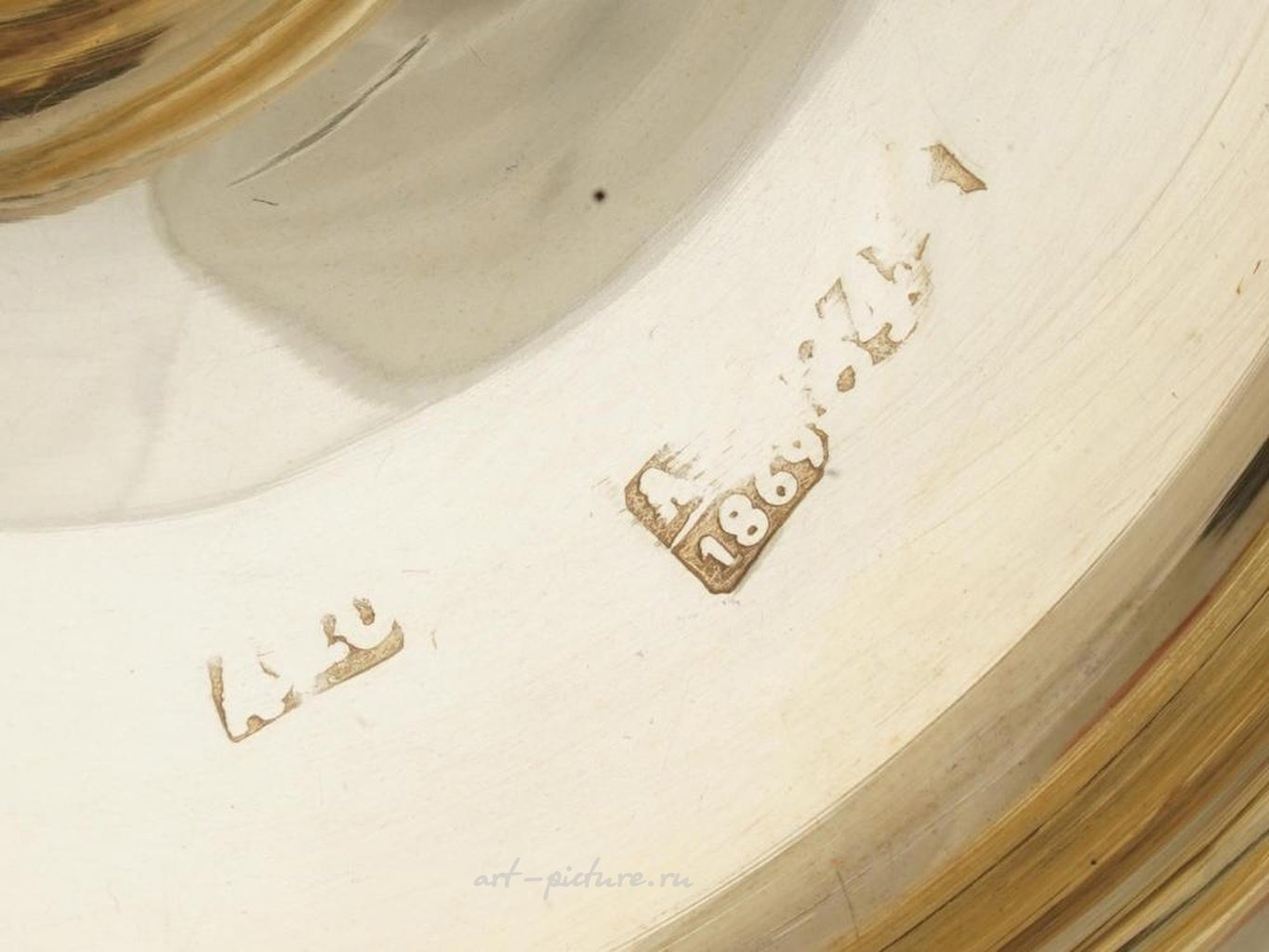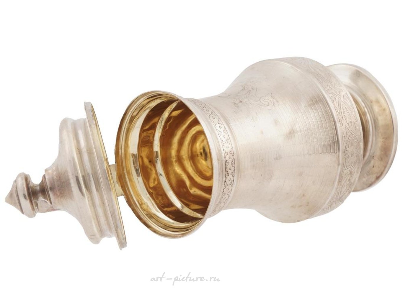 Корпус изделия украшен орнаментом ручной гравировки. Внутренняя поверхность покрыта позолотой. Клеймо серебряного стандарта 84 пробы и марки изготовителей расположены на дне. Вес: 317 грамм. Коллекционное Русское Столовое Серебро, Столовые Приборы и Сервировочные Принадлежности.
