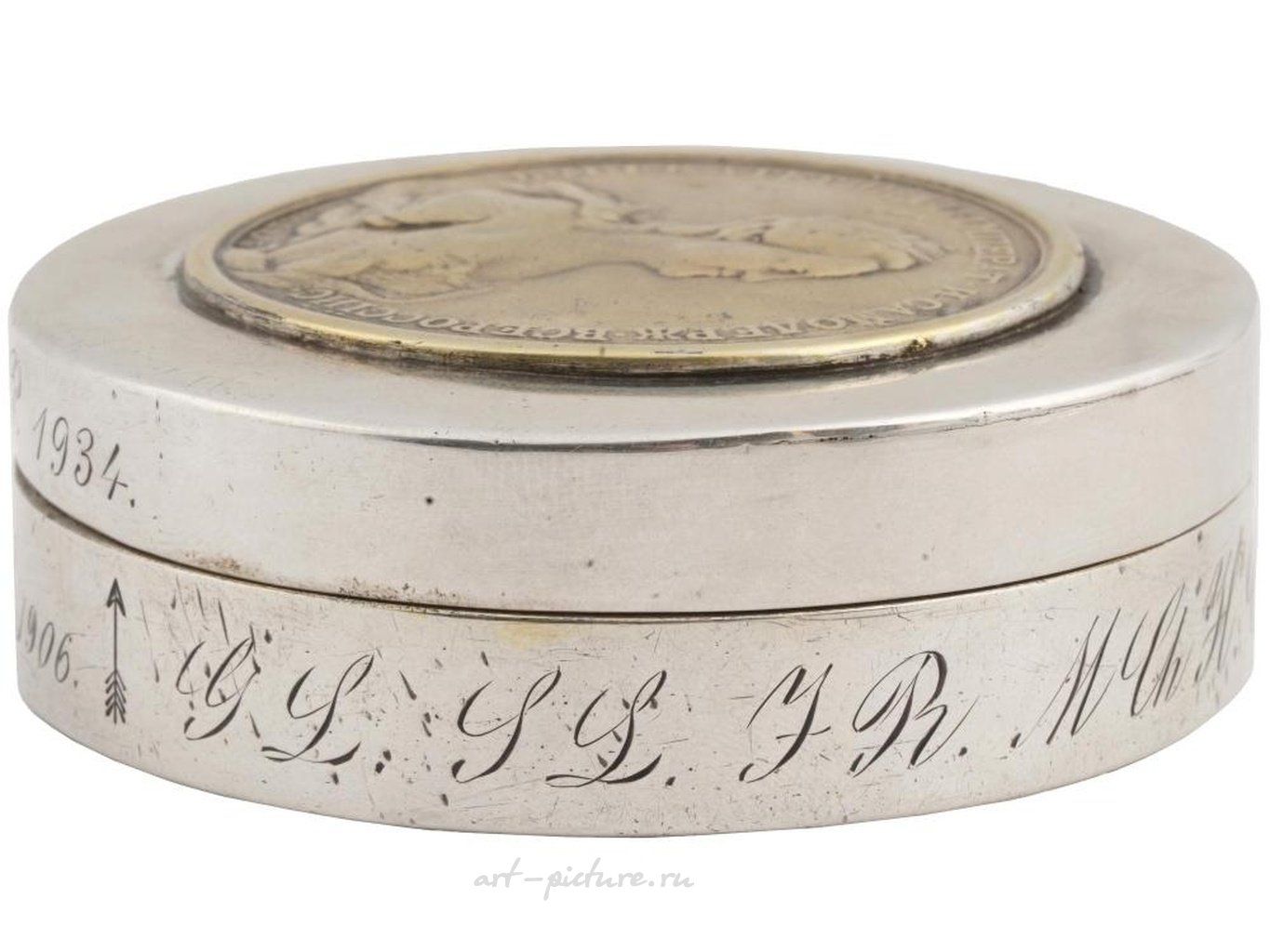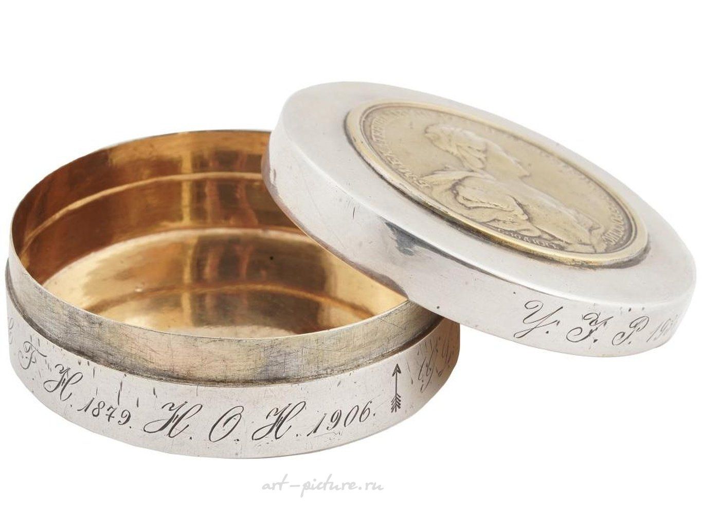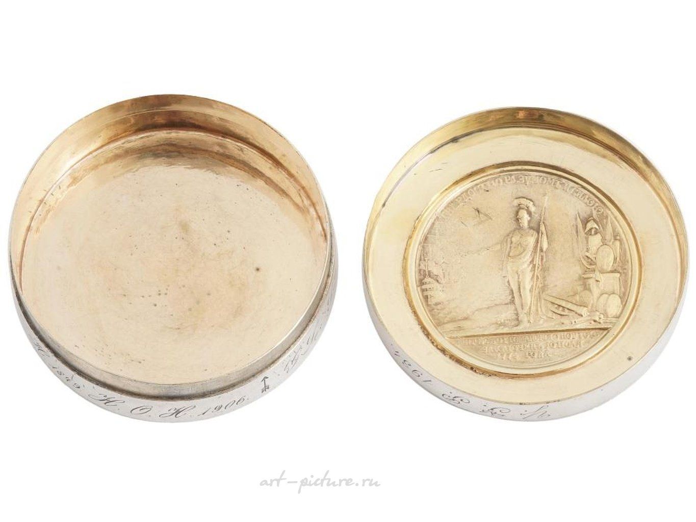 Большая антикварная серебряная табачная или специйная коробка с очень редкой медалью Катерины Второй, посвященной мирному договору с Турцией 10 июня 1774 года. Крышка круглой формы серебряной коробки, украшенной медалью 1774 года, с гравировками С. Юдина и Г. К. Вехтера, посвященной мирному договору с Турцией 10 июля 1774 года, изображает бюст императрицы Екатерины II на внешней стороне и изображение Паллады Афины.