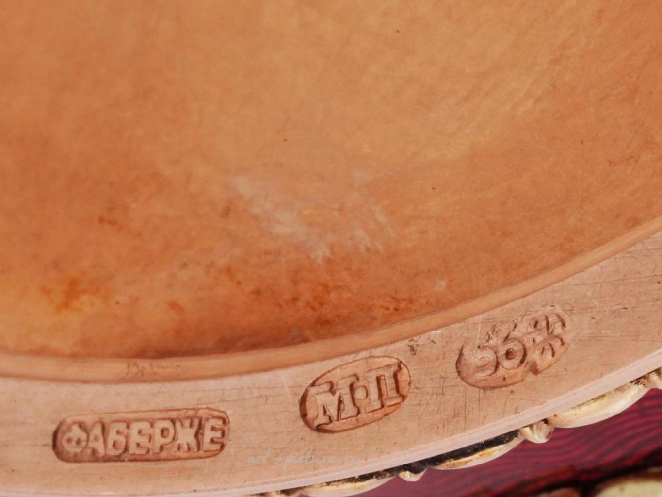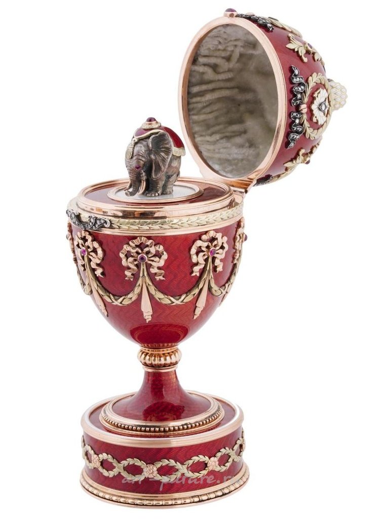 Прекрасное русское презентационное яйцо овальной формы, корпус которого покрыт красной эмалью на фоне волнистого гильоше и украшен прикладными двухцветными золотыми гирляндами, связанными лентами и украшенными кабошонными рубинами. Крышка на шарнире также украшена прикладными золотыми венками, имперскими орлами, украшенными рубинами и бриллиантами, и украшена рельефной имперской короной, украшенной белой эмалью и украшенной бриллиантами. Крышка открывается, чтобы показать милую