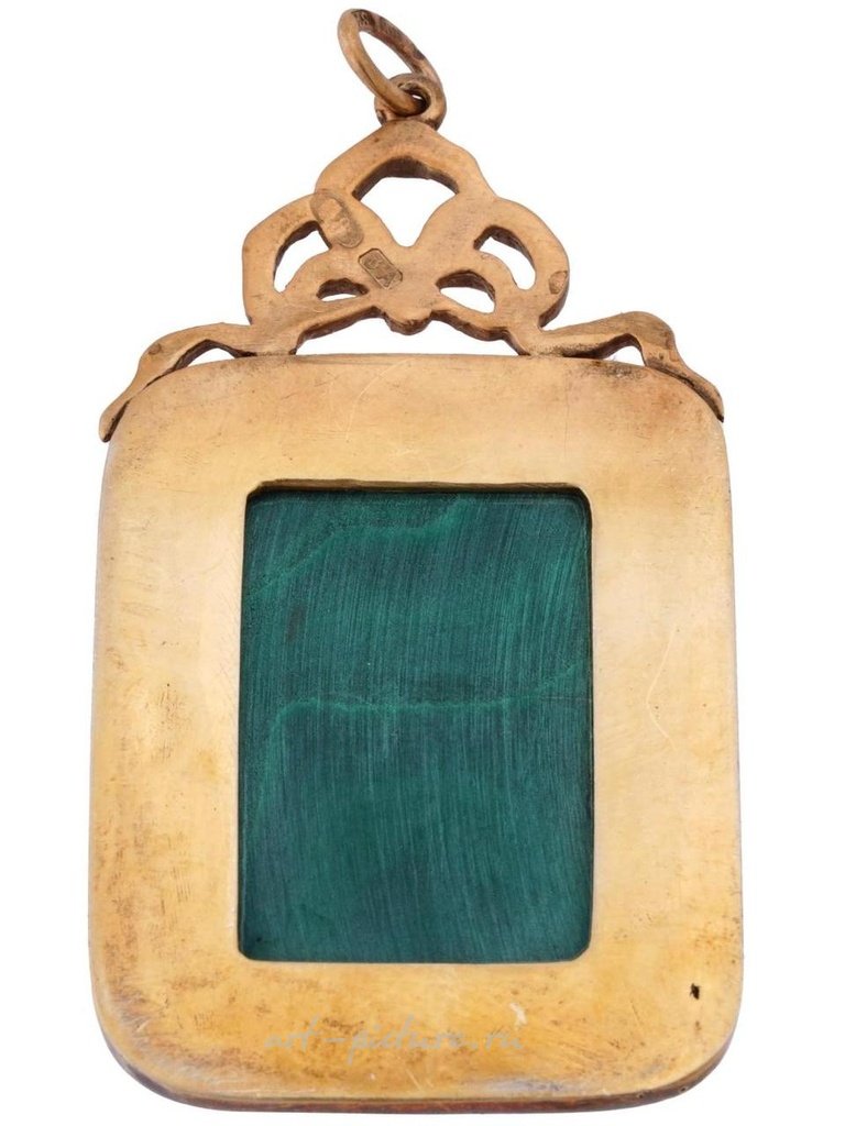 и ручная резьба по малахиту. Подвеска украшена налетом, изображающим двуглавого Императорского орла, покрытого эмалью в белом оттенке, и инкрустирована рубинами в центре и в углах. На верхушке подвески изображена фигурная бант с лентами. Помечена клеймами 88 русского серебра и производителя. Общий вес: 36 г. Русские серебряные подвески и аксессуары для коллекционеров.