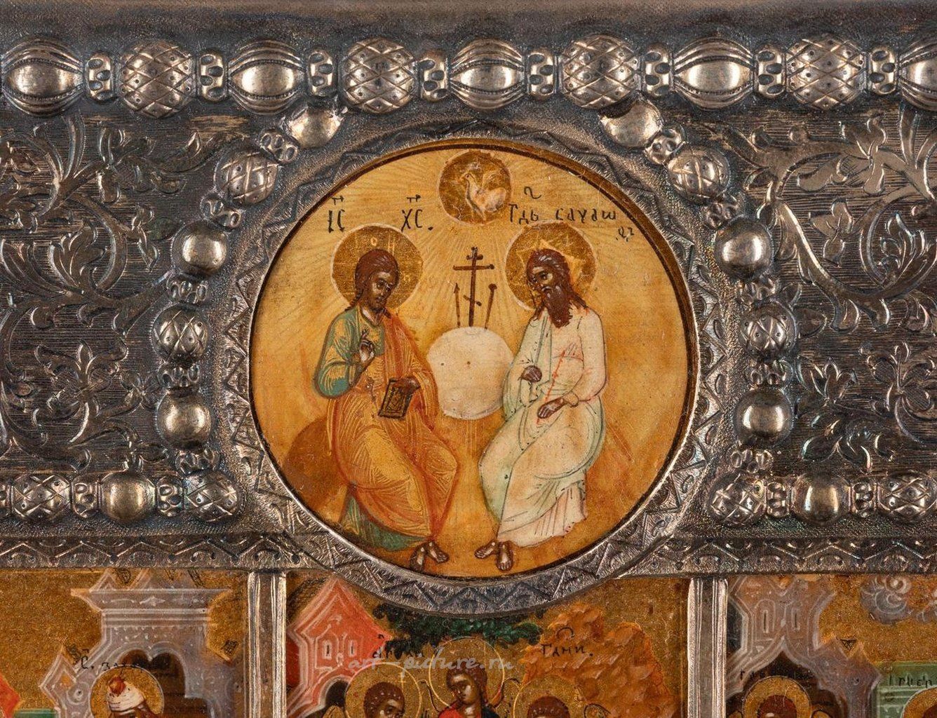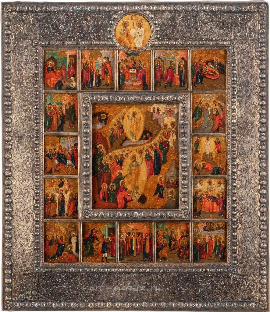 Подписанная икона Воскресения с 16 праздниками и позолоченной серебряной басмой вермель-басма. Русская, Москва, мастерская Силина и Алексеева, конец 19 века (икона), русская, Москва, Семен Галкин, конец 19 века (басма) Москва, Семен Галкин, конец 19 века (басма) Темпера на деревянной панели с двойным ковчегом.