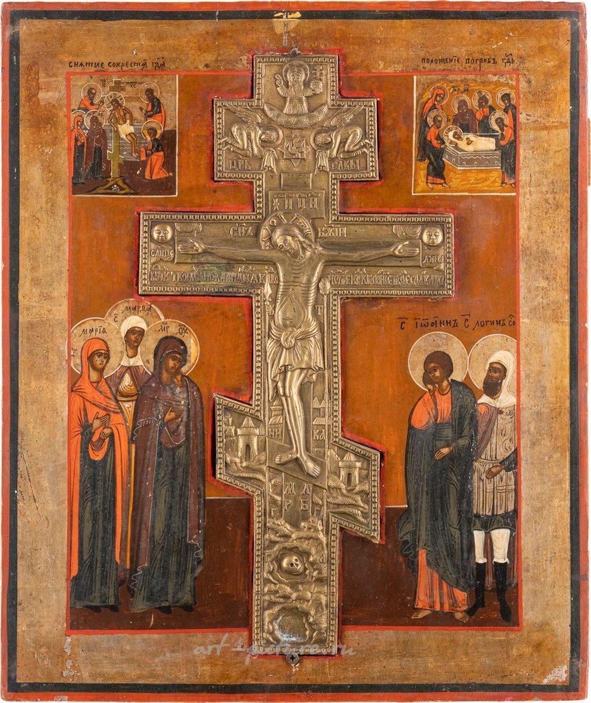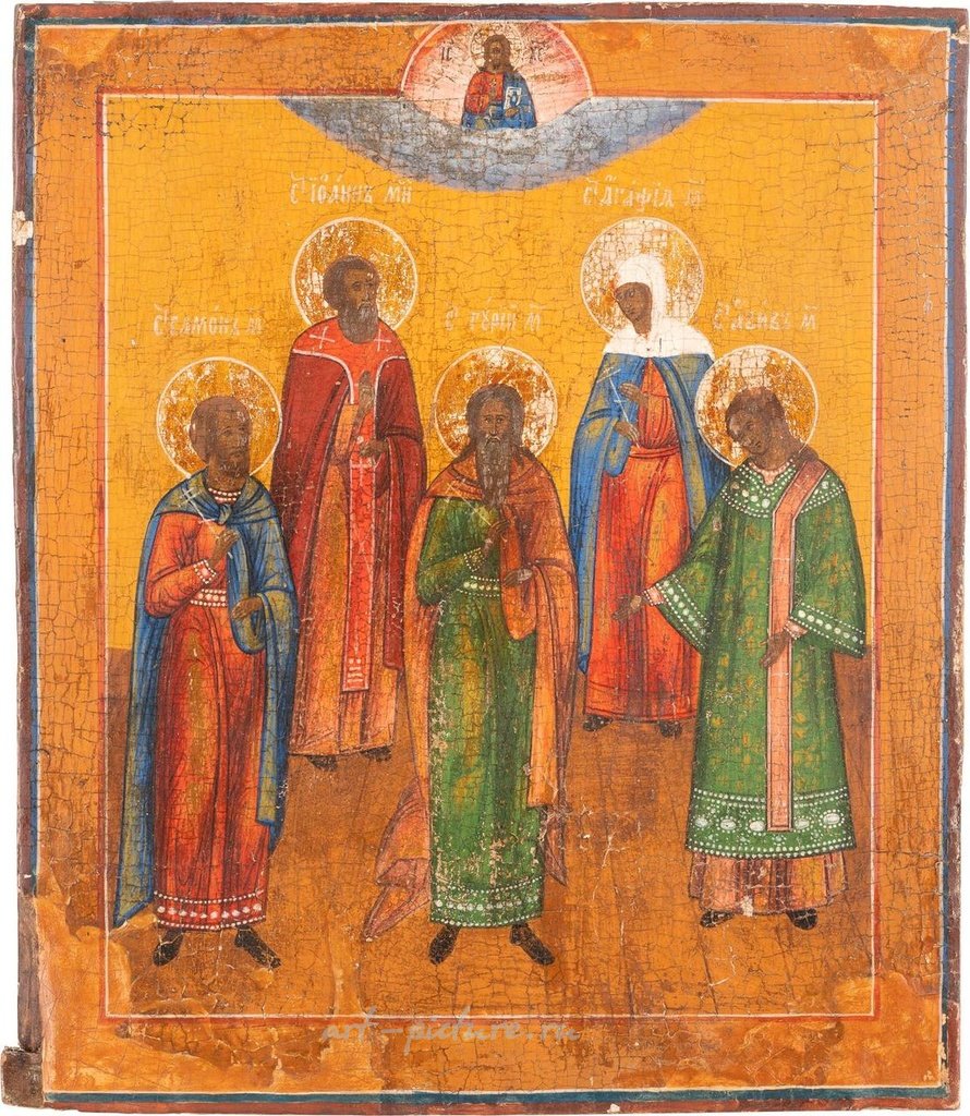 Русская, 19-й век, темпера на деревянных панелях. Ореолы изготовлены из серебра, покрытого золотым лаком. Медный крест вставлен в панель. Износ, реставрации. Размеры: 35,8 х 30,6 см / 44,4 х 37,3 см. Патриархальная икона с пятью святыми и большим форматом.