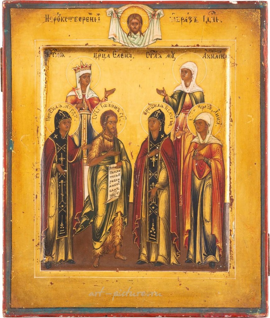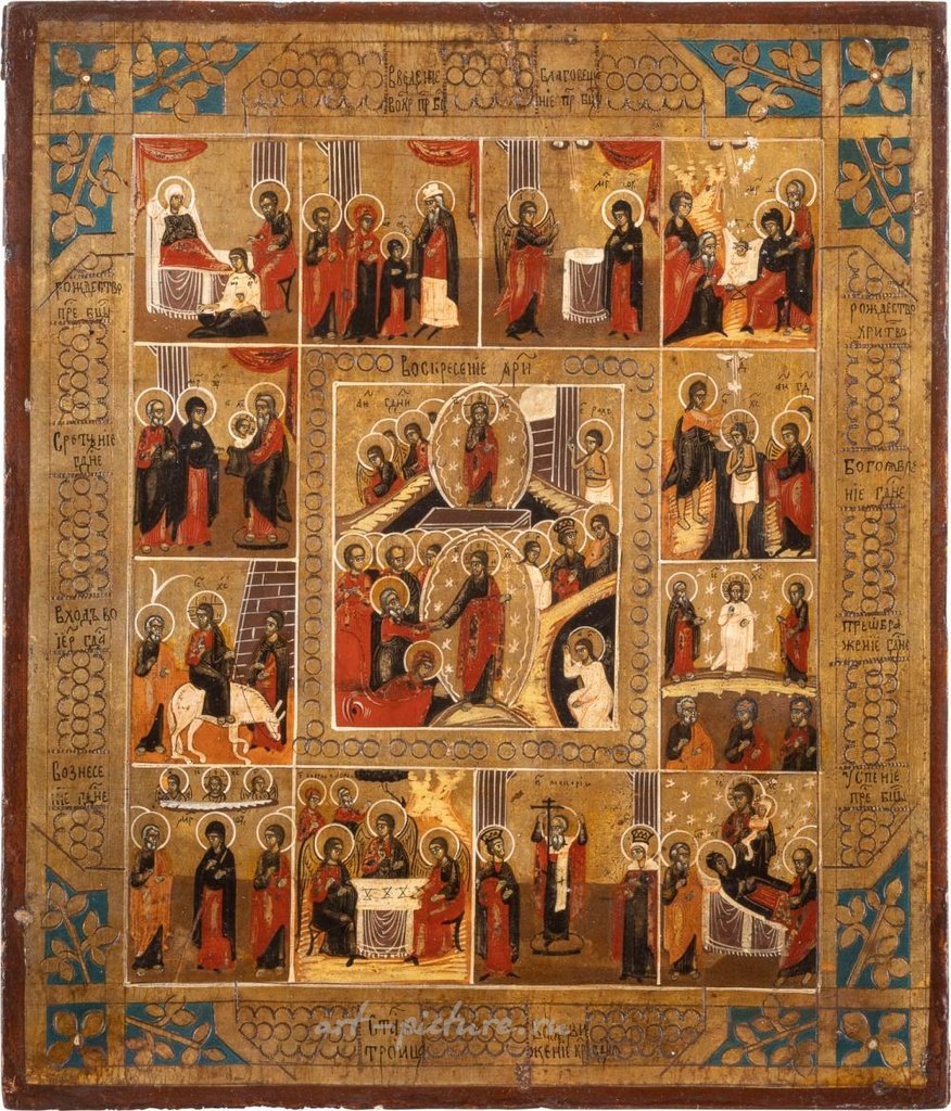ЧЕТЫРЕХЧАСТНАЯ ИКОНА, ПРАЗДНИЧНАЯ ИКОНА И ИКОНА ТРЕХРУКОЙ БОЖЬЕЙ МАТЕРИ С русским ОКЛАДОМ, темпера 18-19 веков на деревянных панелях. Фон выполнен из золота и серебра, покрыт золотистым лаком. Обложен латунным окладом. Частично поврежден и отреставрирован. Высота 22,2-31 см. ЧЕТЫРЕ ИКОНЫ