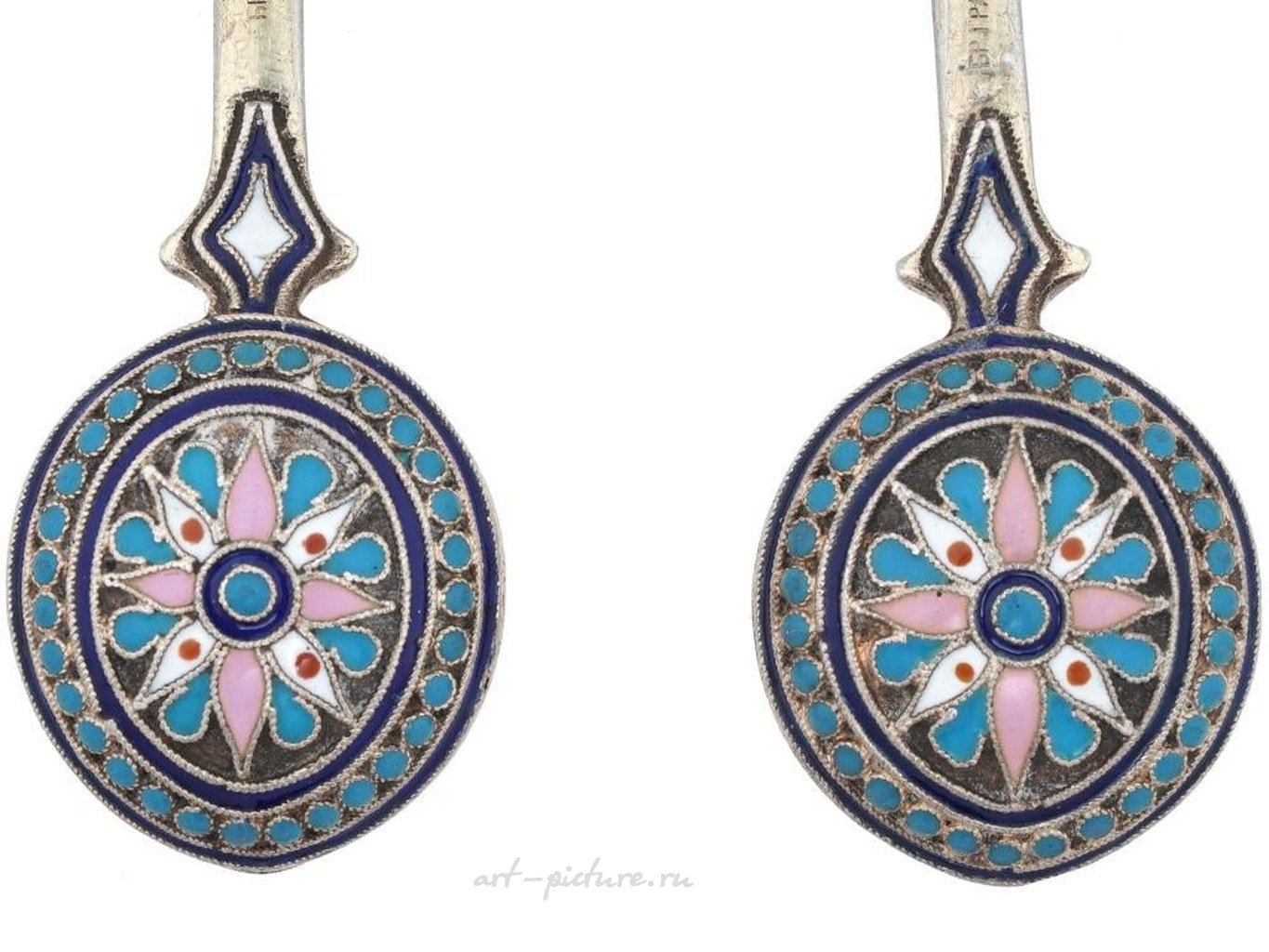 Ложки имеют круглые чашечки и плоские широкие ручки. На каждой ложке имеется клеймо стандарта серебра 88 пробы и клеймо производителя на ручке. Общий вес: 52 грамма. Русское Столовое Серебро, Столовые Приборы и Сервировочная Посуда.