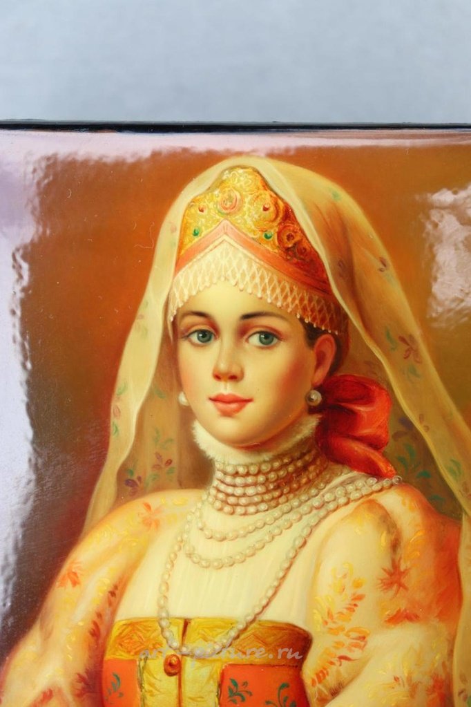 Ручная миниатюрная портретная картина принцессы Зинаиды Юсуповой (около 1900 года), выполненная Страховой из Федоскино; Высококачественная миниатюра от Страховой. Оригинал от Константина Маковского. Размер коробки: 102 мм х 88 мм х 45 мм = 10,2 см х 8,8 см х 4,5 см; • Оригинальное название: Портрет принцессы Зинаиды Николаевны Юсуповой в русском костюме.