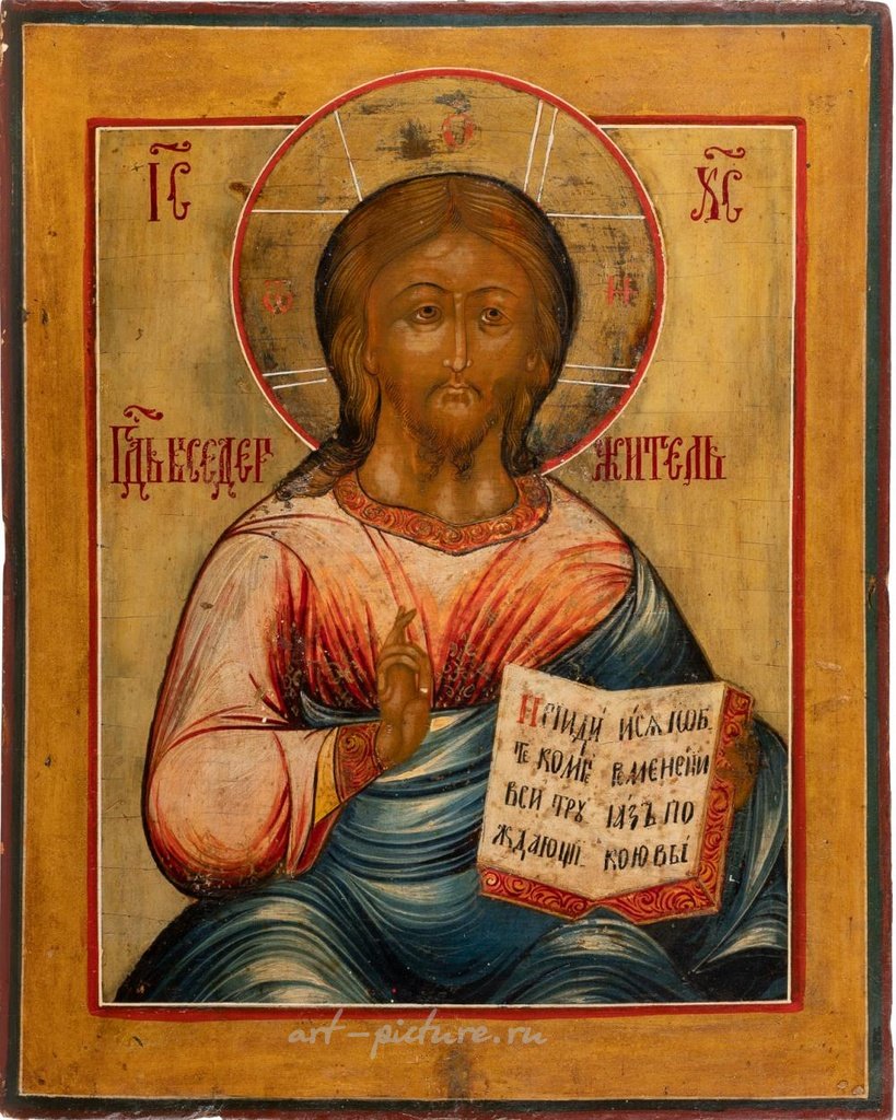 БОЛЬШАЯ ИКОНА, ИЗОБРАЖАЮЩАЯ ХРИСТА ПАНТОКРАТОРА Русская икона 19 века. Темпера на деревянной панели. Ореол изготовлен из серебра, покрытого золотым лаком. Края незначительно обломаны, незначительно восстановлены. Размеры 40,9 x 32 см. БОЛЬШАЯ ИКОНА С ХРИСТОМ ПАНТОКРАТОРОМ Россия, 19 век. Композит из двух досок с двумя задними шпонками (одна потеряна). Яичная темпера на меловой основе, серебряный ореол с золотым лаком.