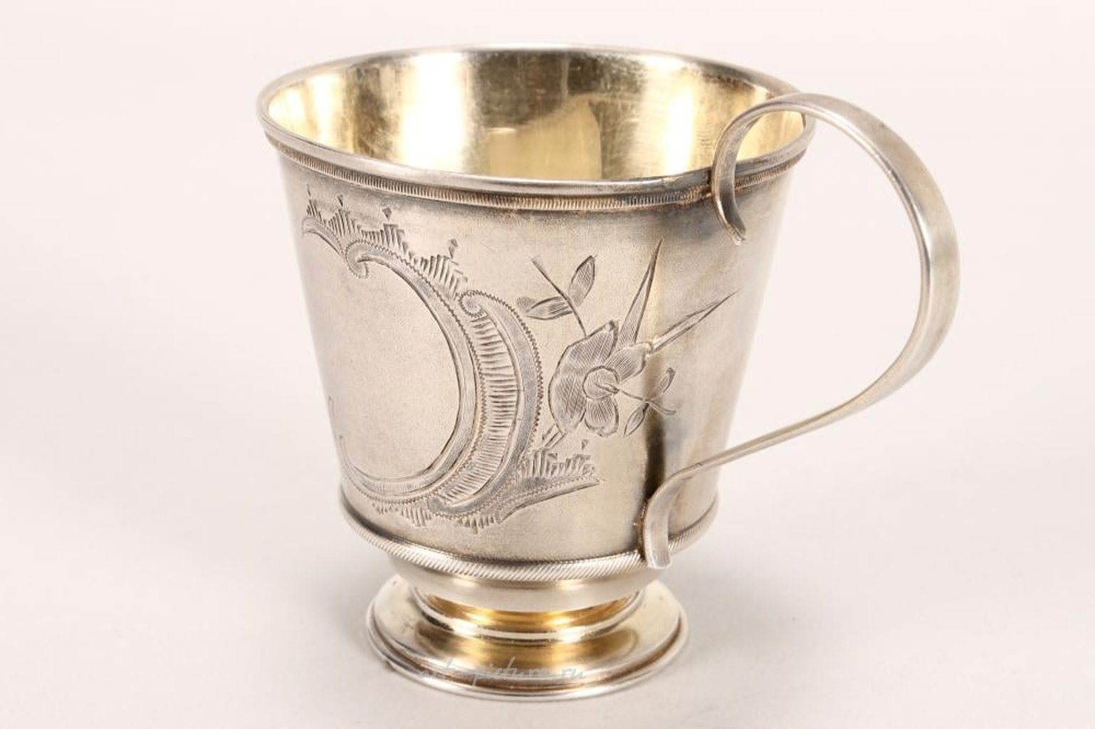 Серебряная чарка, помеченная "84", "Б.Ф" (кириллицей), имеет форму узкой цилиндрической, украшенную гравировкой цветочных веточек, с круглой ножкой и позолоченным внутренним покрытием. Общий вес составляет 63 г, высота - 7,5 см.