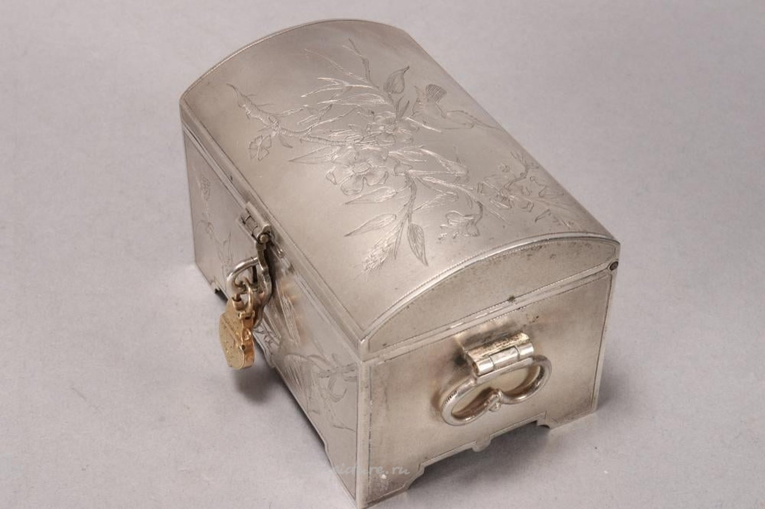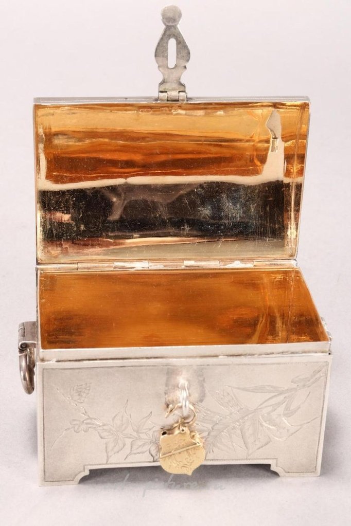 Отмечено, Москва, 84, Н.Б. (кириллицей), в форме шкатулки с матовой отделкой и тонко гравированными птицами среди цветов и листвы, с двумя ручками по бокам, с замком и золоченым замком, вся конструкция установлена на четырех ножках, общий вес 170 грамм.