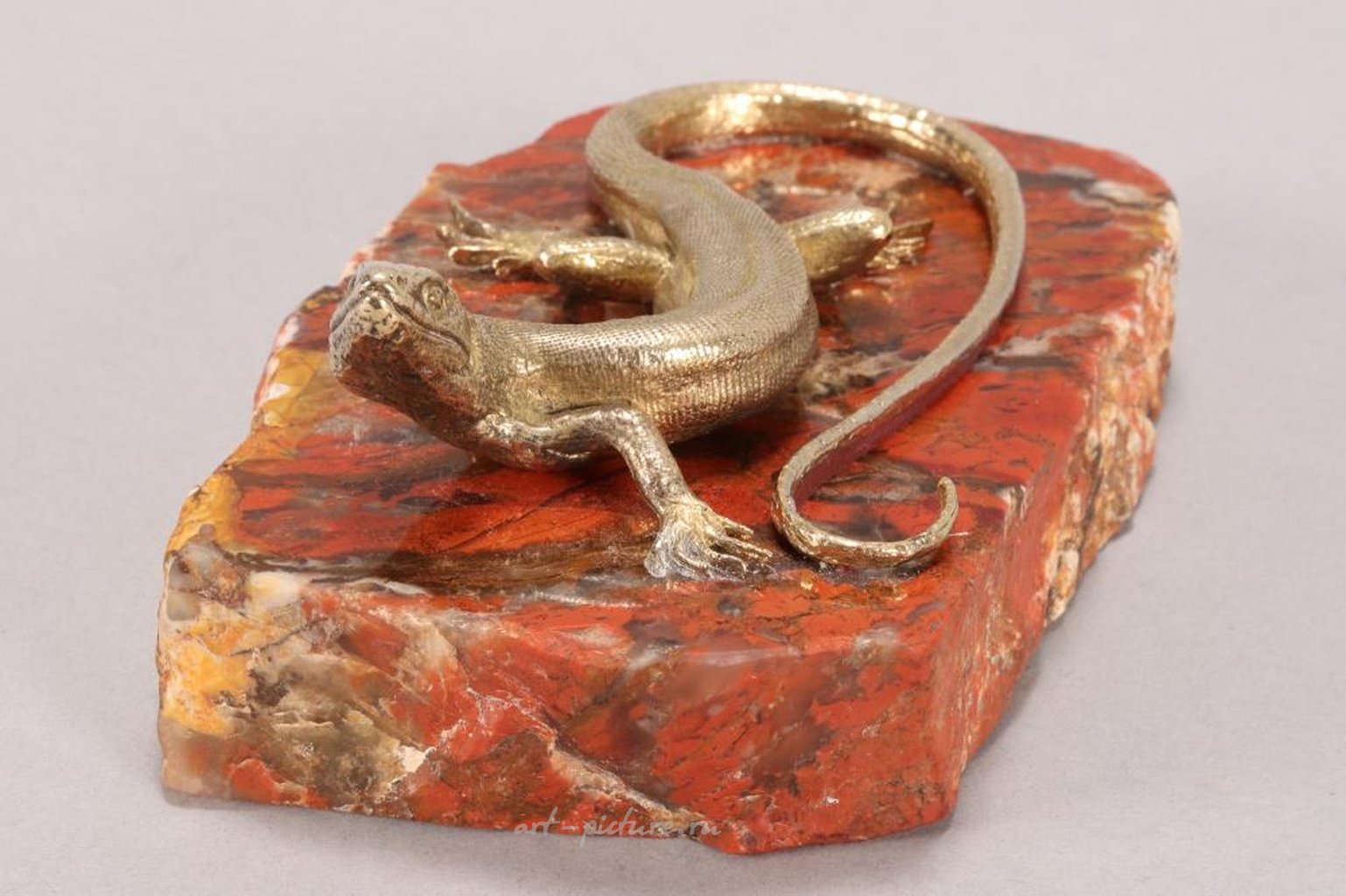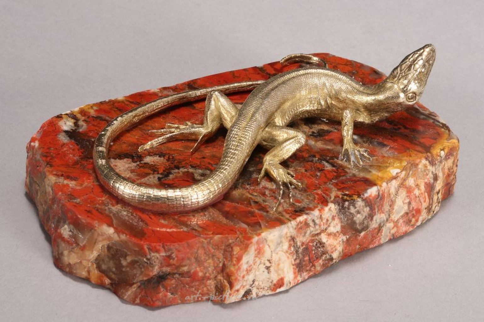 Серебряная подставка на розовом мраморном основании, с отпечатками, 84 и маркером, с немного поднятой головой и скрученным хвостом рядом, длина 14 см.