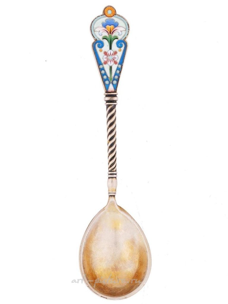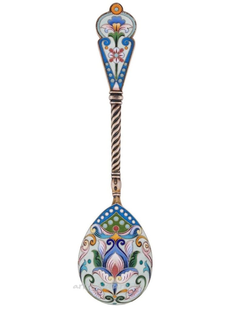 Русская серебряная ложка с глубокой чашей, закрученной ручкой и фигурным наконечником. Украшена на чаше и ручке многоцветными эмалевыми мотивами с бисерными узорами, изготовленными в технике клоизонне. Помечена клеймами 88 пробы русского серебра и марками производителя. Общий вес: 67 г. Коллекционные предметы русской серебряной ложки и эмалированной посуды.
