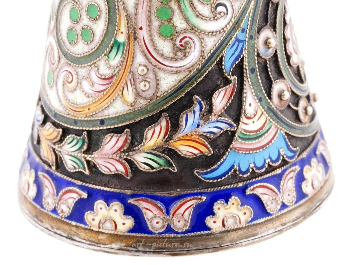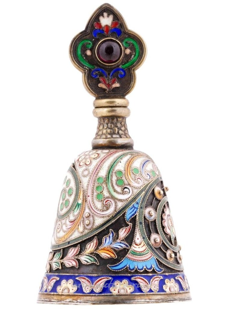Бутылка в форме колокола эмалирована полихромными цветочными, фольклорными, геометрическими узорами, выполненными в технике клоизонне. На горлышке имеется гравированная мотив. Пробка украшена зубчатыми краями. Помечена серебряным клеймом и маркой изготовителя на дне. Общий вес: 51 г. Русская серебряная посуда, столовые приборы, предметы интерьера.