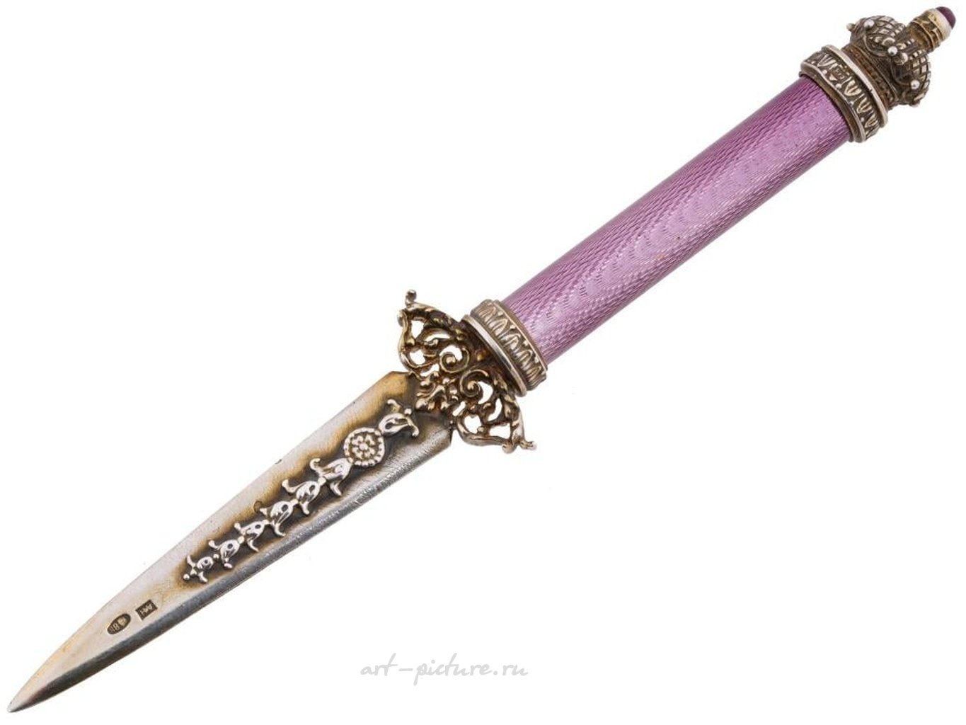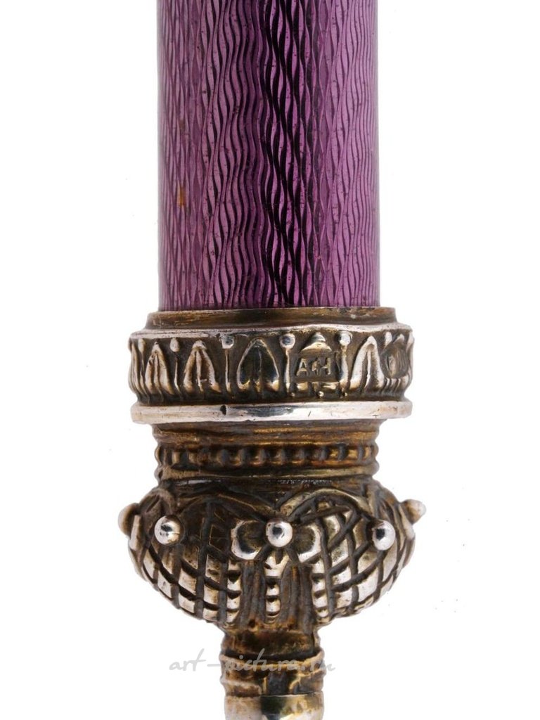 Русский неоклассический бумажный нож или открывалка для писем в стиле римского меча гладиус. Лезвие изготовлено из серебра и имеет фигурную рельефную декорацию. Рукоять украшена фиолетовой гильошированной эмалью. Финишная часть рукояти в форме короны украшена аметистовым кабошоном. Маркировка 88 стандарта серебра и марка производителя находятся на рукояти и на лезвии. Общий вес: 65 грамм. Русские изысканные ювелирные изделия и серебряные изделия, коллекционные аксессуары для письменного стола.