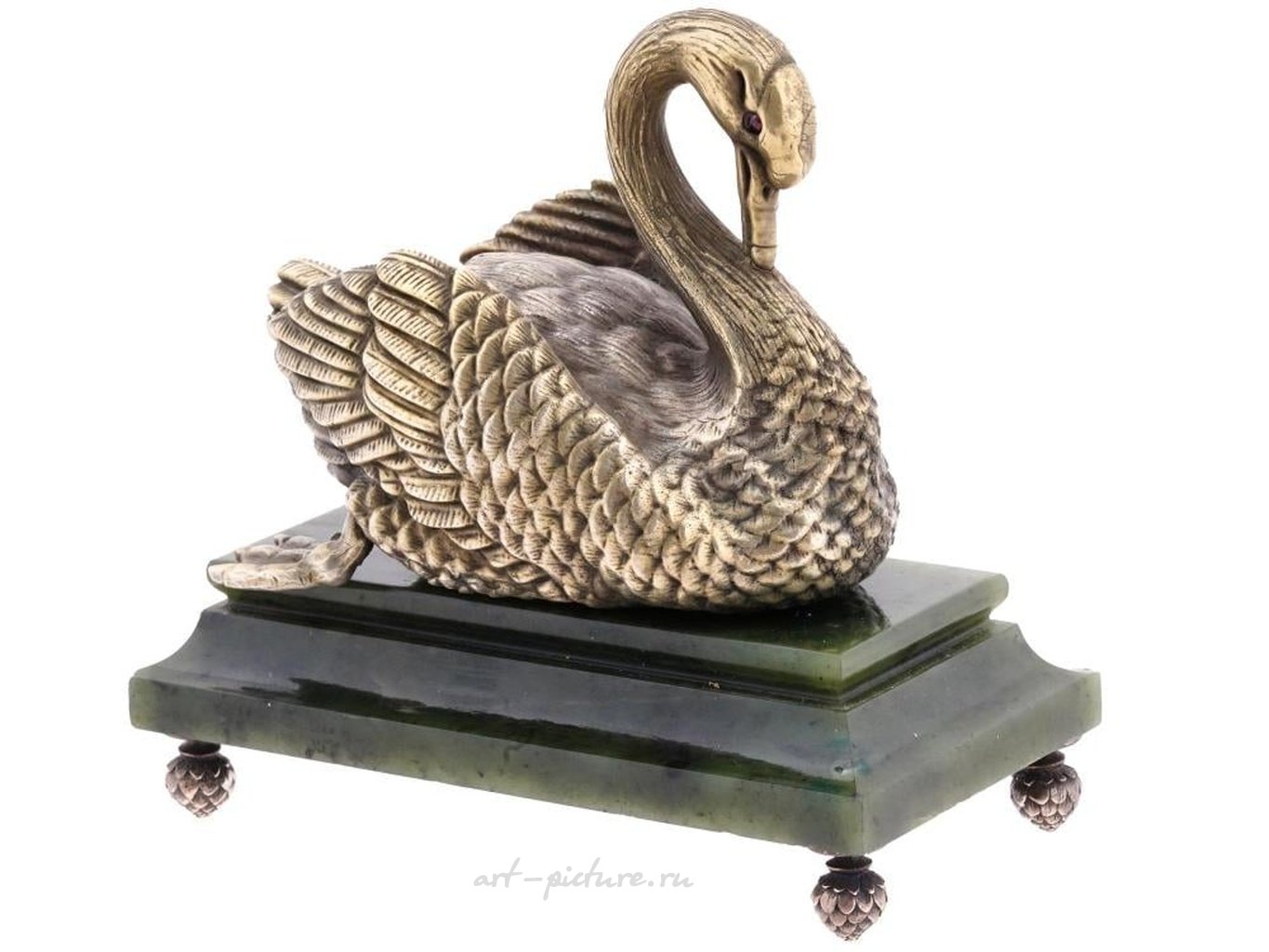 Фигурка установлена на прямоугольной ручной резьбовой подставке из нефрита. Подставка установлена на четырех фигурных ножках, выполненных в форме конуса и выгравированных детальными узорами. Отмечена стандартной русской серебряной клеймой и фабричной клеймом на кириллице. Общий вес: 494 г. Русское серебро и фигурки из натуральных камней.