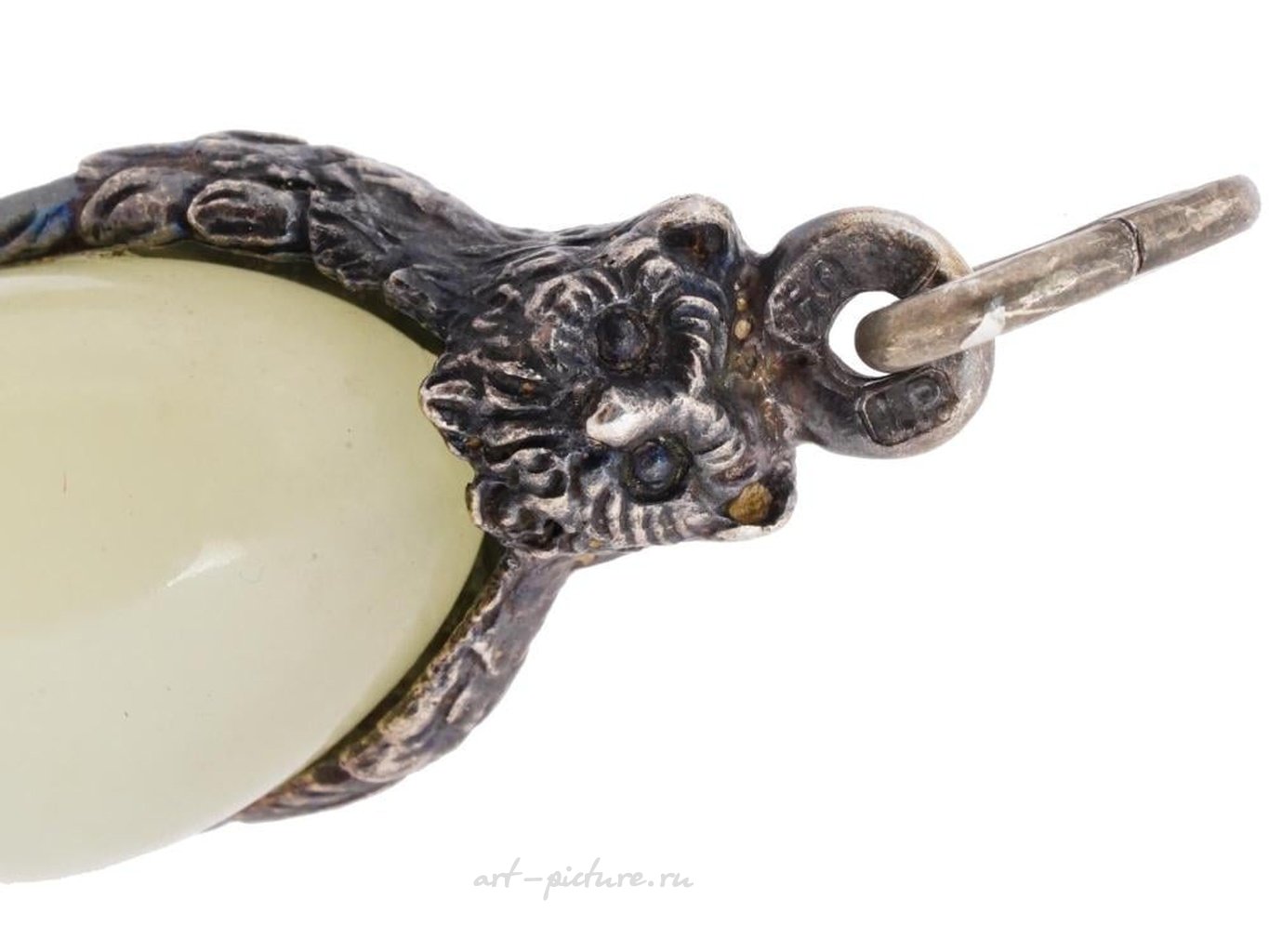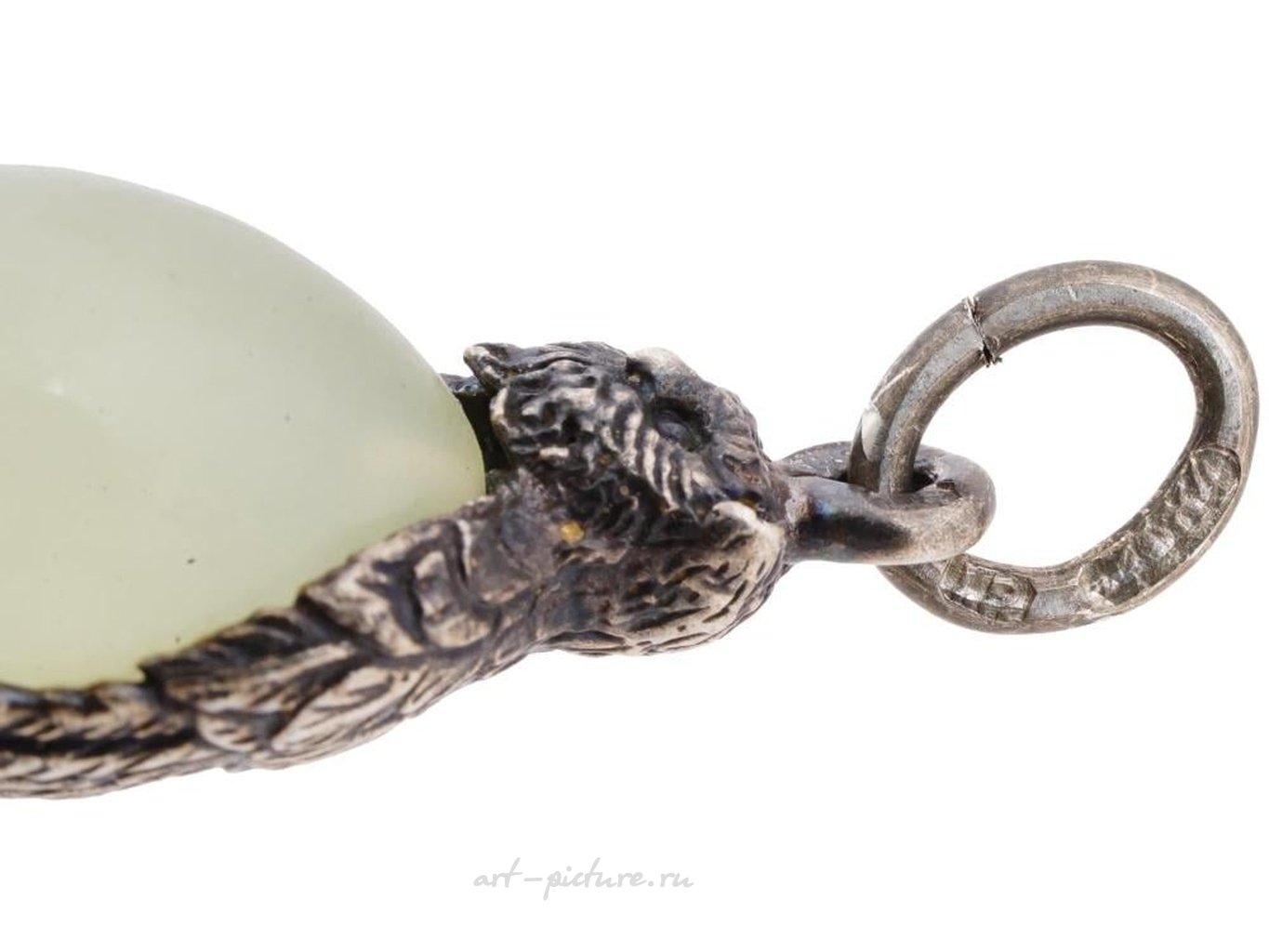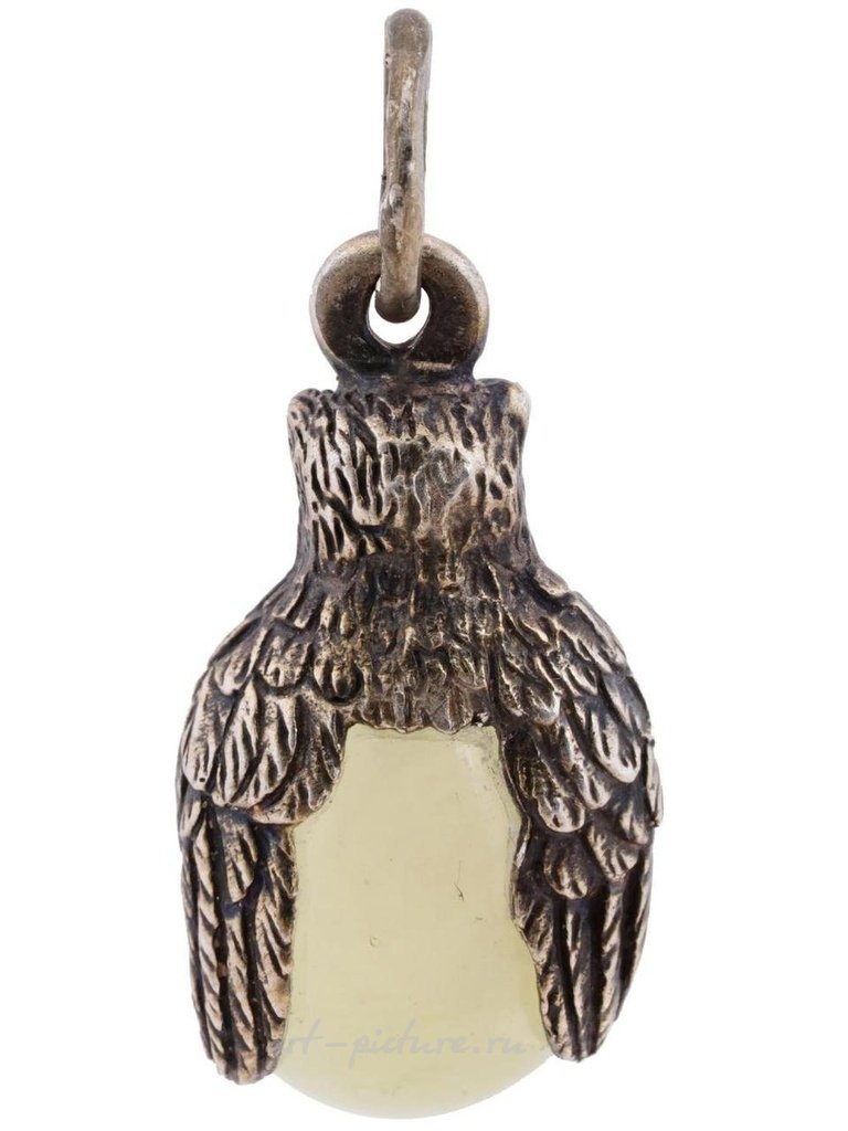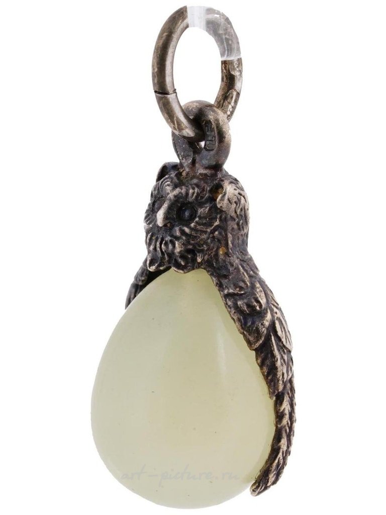 Прекрасное русское миниатюрное яичко-подвеска, ручной работы из натурального бледно-зеленого нефрита, установленное в серебряную позолоченную оправу, выполненную в виде совы. Отмечено на подвеске отметкой 84 русского имперского стандарта и маркой производителя. Ручная работа, изысканное ювелирное изделие, антикварные русские украшения для коллекционеров, подарки и аксессуары для женщин. Общий вес: 5,3 г.