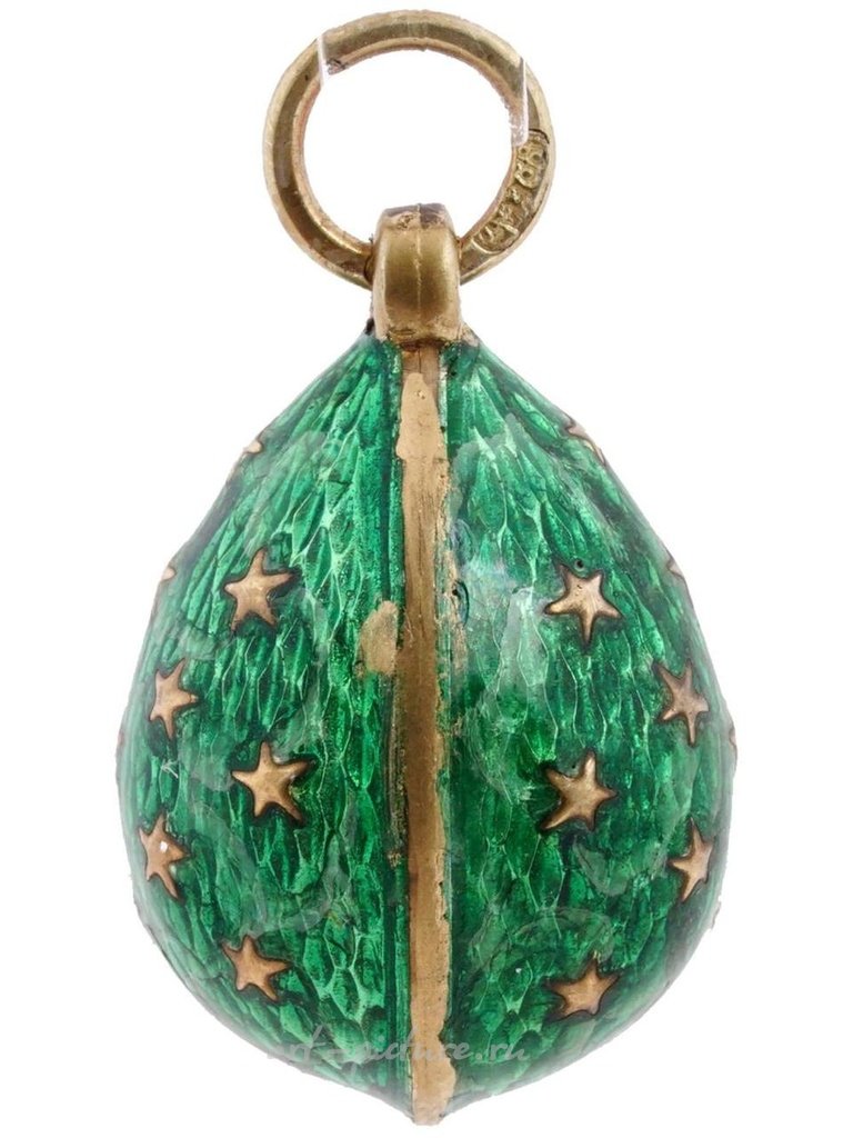 Прекрасное русское миниатюрное пасхальное яйцо-подвеска, изготовленное из позолоченного серебра. Поверхность покрыта мерцающей зеленой гильоше эмалью и украшена выпуклым орнаментом из позолоченного серебра в виде звезд. На кольце крепления имеется клеймо с указанием 88-го императорского русского серебряного стандарта и маркировкой производителя: АТ. Ручная работа, изысканное ювелирное украшение, русский ювелирный бренд для коллекционеров, подарков и аксессуаров для женщин. Общий вес: 5,4 г.