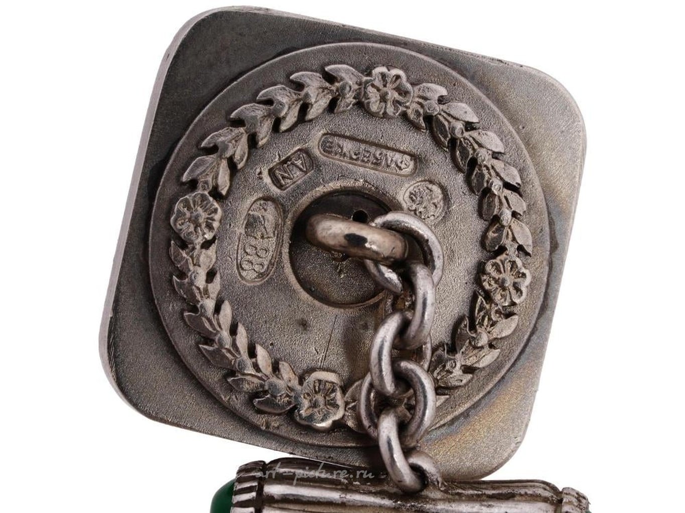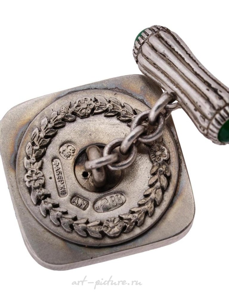 Пара запонок на цепочке из русского серебра. На лицевой стороне изображены свиные головы с глазами из аметистовых камней. Задняя сторона украшена нефритовыми кабошонами. На каждом изделии есть клеймо стандарта серебра 88 пробы и метки производителя на обратной стороне. Общий Вес: 25 грамм. Российские Ювелирные Изделия, Столовое Серебро И Предметы Коллекционирования.