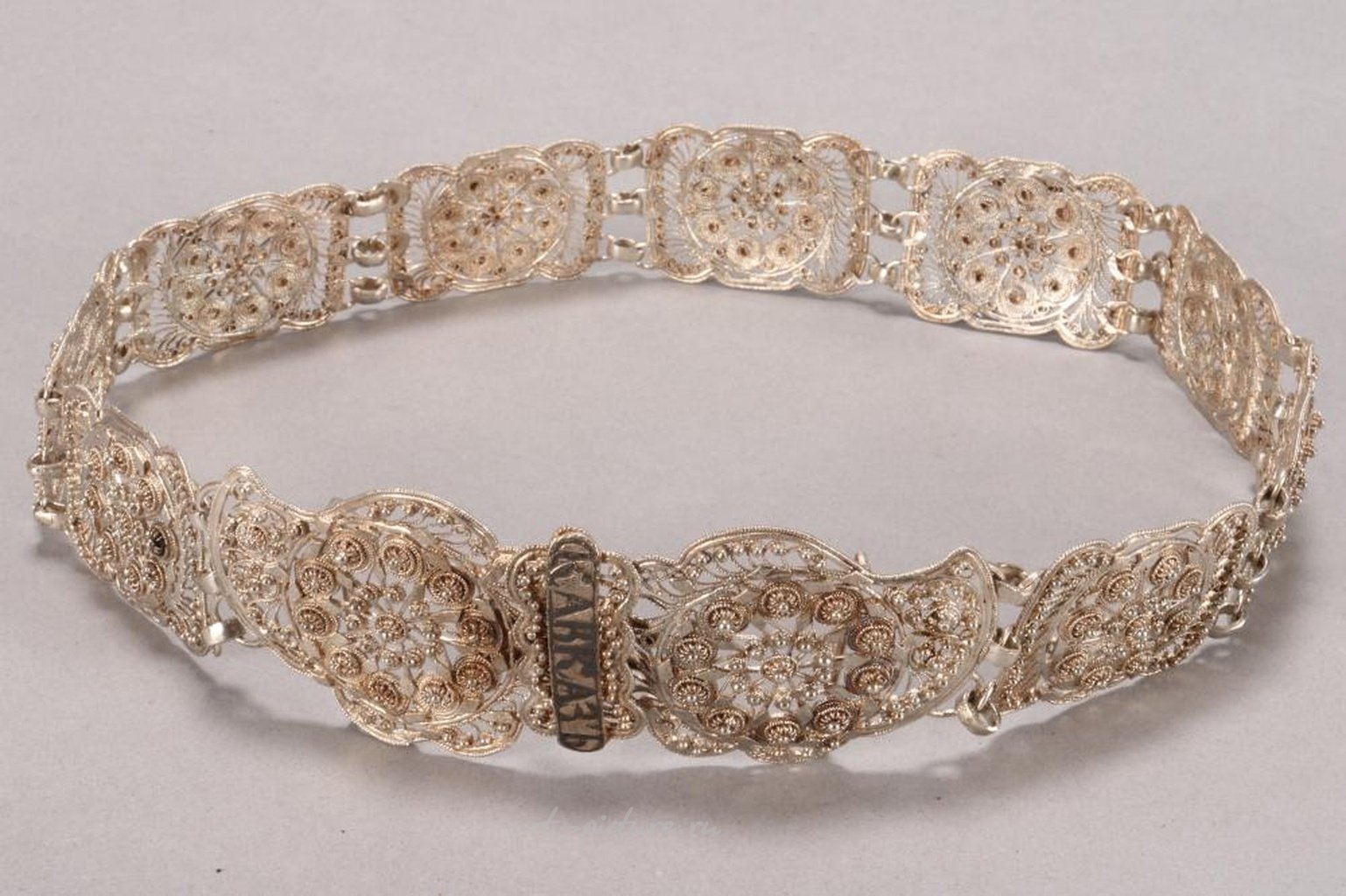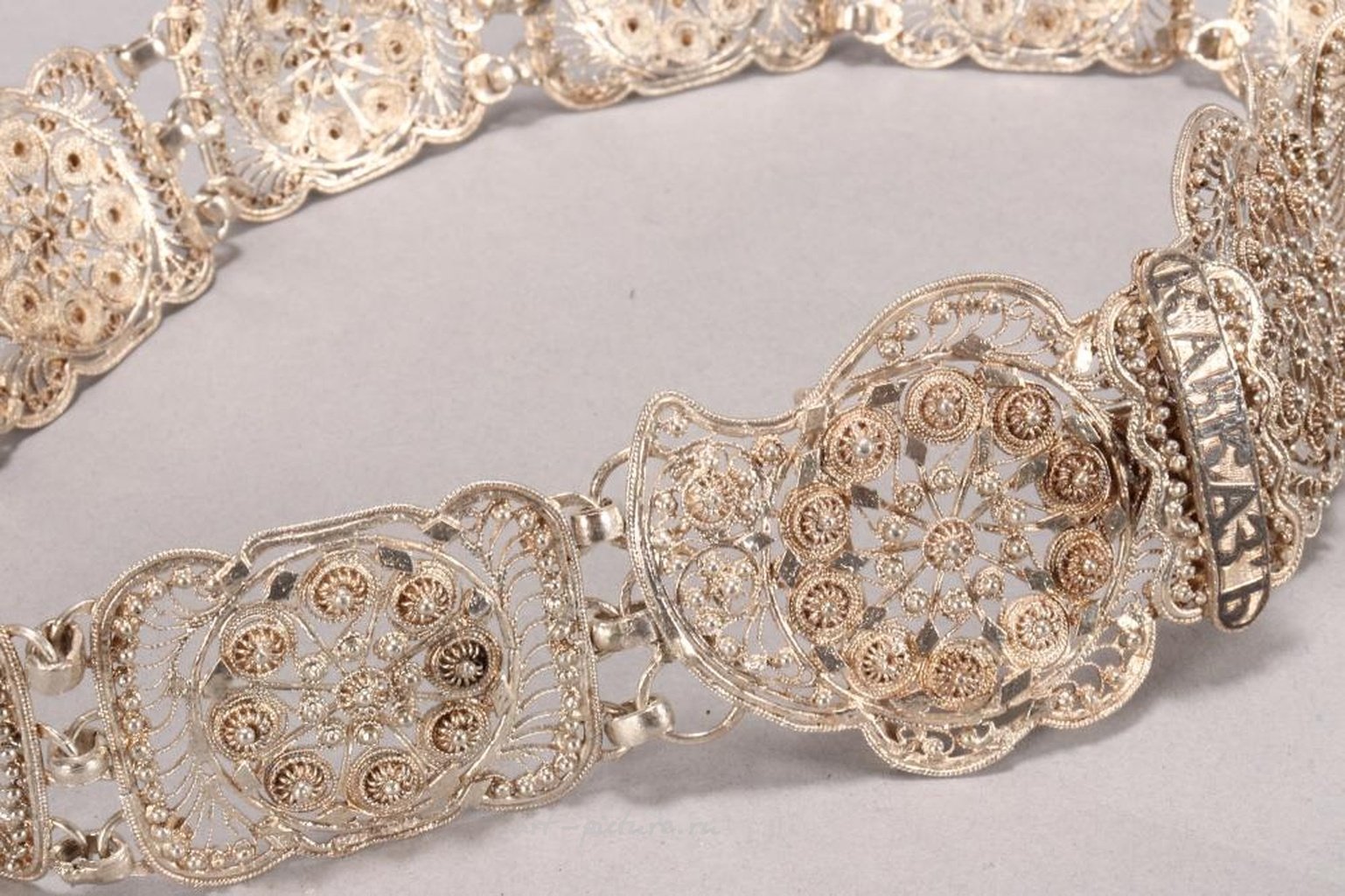 Серебряный пояс конца 19 века, каждое звено с клеймом 84 и городской маркой, каждое звено с изысканным филейным орнаментом, с ниелловой кириллической надписью на пряжке, общий вес 143 г, общая длина 57 см, Происхождение: Sotheby's, лот 96, 26/01/1981