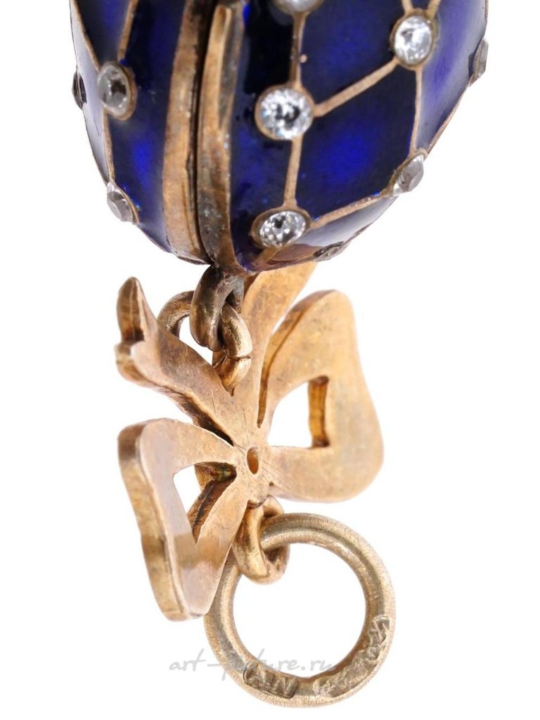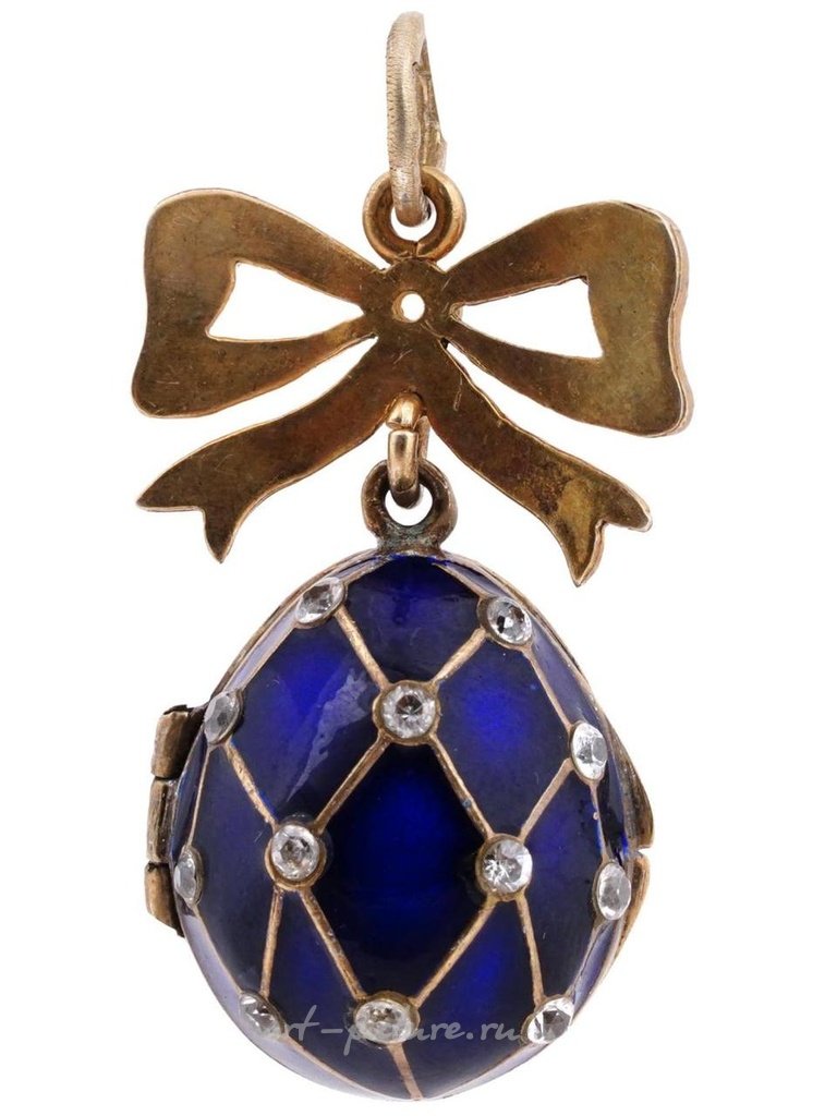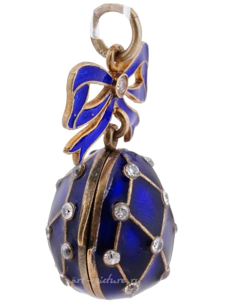 Русская сферическая подвеска в форме шара, изготовленная из позолоченного серебра 84 пробы и покрытая глубокой кобальтовой эмалью. Внешняя сторона подвески украшена бриллиантами и выполнена в сетчатом дизайне. Подвеска состоит из двух соединенных половинок. Внутренняя сторона покрыта позолотой и имеет пустое место для хранения памятных вещей. К подвеске прикреплено дополнительное украшение в виде банта, покрытого эмалью и украшенного круглым бриллиантом в центре. Коллекционное русское серебряное и золотое ювелирное изделие, русская декоративная коллекция.