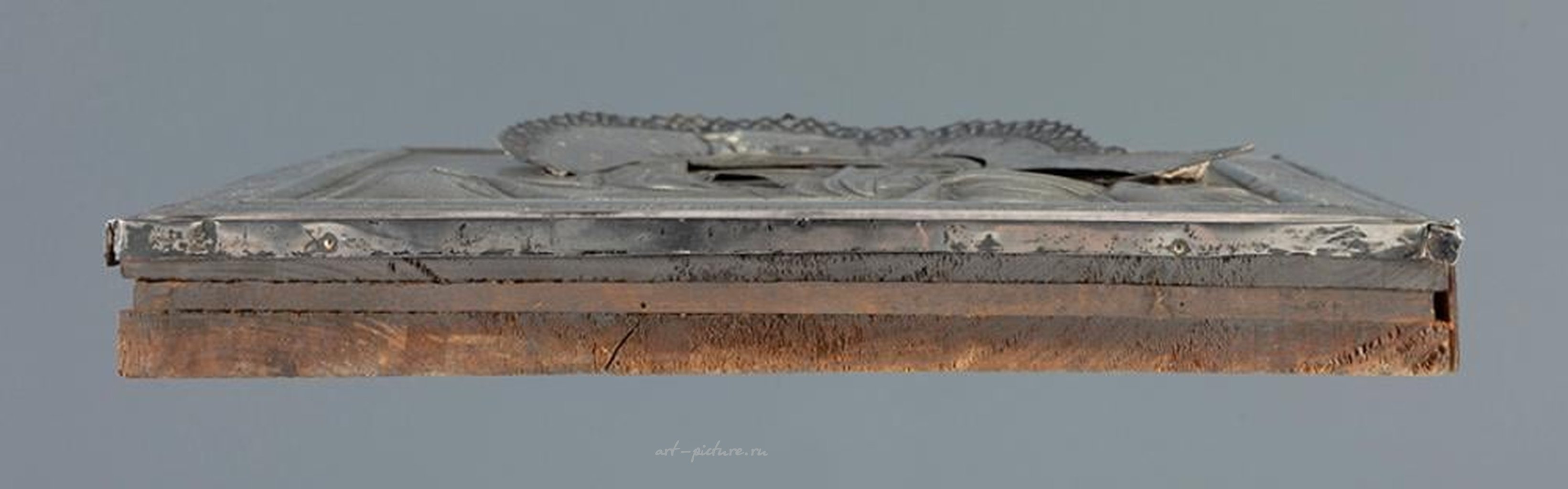19-вековая русская икона. "Богоматерь с Младенцем". Живопись на дереве. Серебряный оклад. Серебряные клейма 84, мастерская неизвестна. С контрастами на нижней части. Небольшие вмятины и трещины на боковой стороне серебра. Повреждения от древоточцев. Размеры: 31 x 27 x 3 см. Русская икона, написанная темперой на доске с выточенным и рельефным серебром, на которой изображена Богоматерь с Младенцем Иисусом.