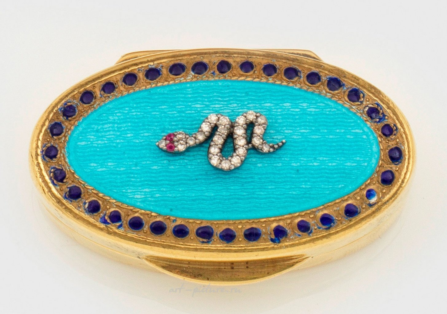 в стиле Карла Фаберже. Позолоченное и эмалевое. Овальная форма. Крышка на петлях, в центре установлена рельефная змея, украшенная маленькими белыми и красными алмазными розами на светло-голубом эмалевом и гильошированном волновом фоне. Окружающая рамка с голубой эмалевой точечной отделкой. Вес около 30 г. Высота 1,5 см. Размеры 4,2 см x 2,5 см. Русская позолоченная серебряная и эмалевая коробочка для таблеток с змеей в стиле Карла Фаберже.