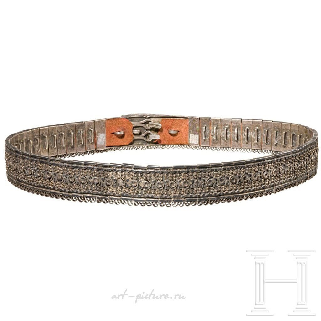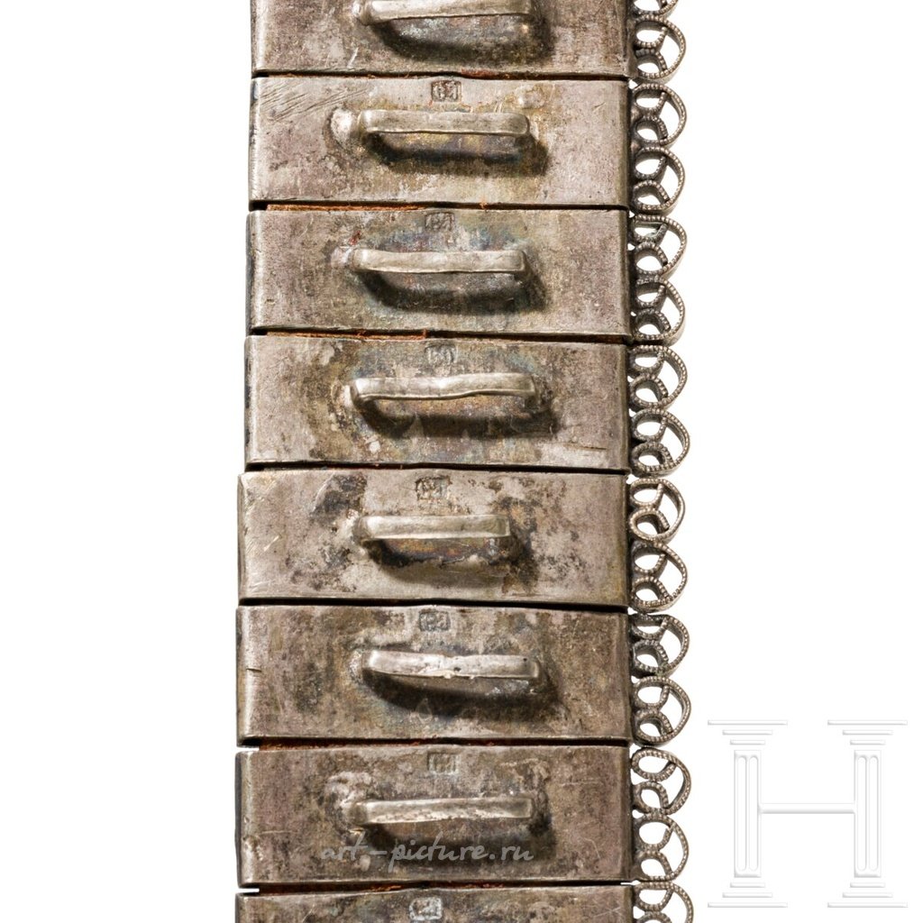 Тяжелый серебряный и нефритовый пояс, Кавказ, конец 19 века. Серебро, частично нефритовое, остатки позолоты; кожаный ремень. 61 узких серебряных звеньев, двухчастный серебряный пряжка, на кожаном ремне. Массивная двухчастная серебряная пряжка в форме горба, украшенная нефритовыми листьями и цветочными мотивами. Все детали с рельефным, частично нефритовым виноградным узором. Все детали имеют клейма на обратной стороне с городским клеймом и неразборчивым клеймом мастера "S?".